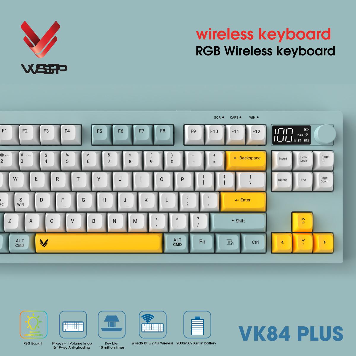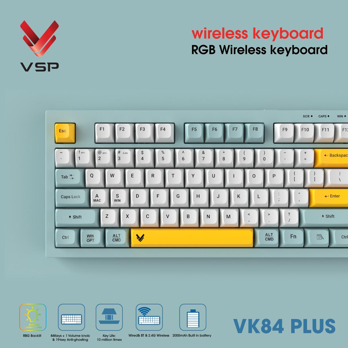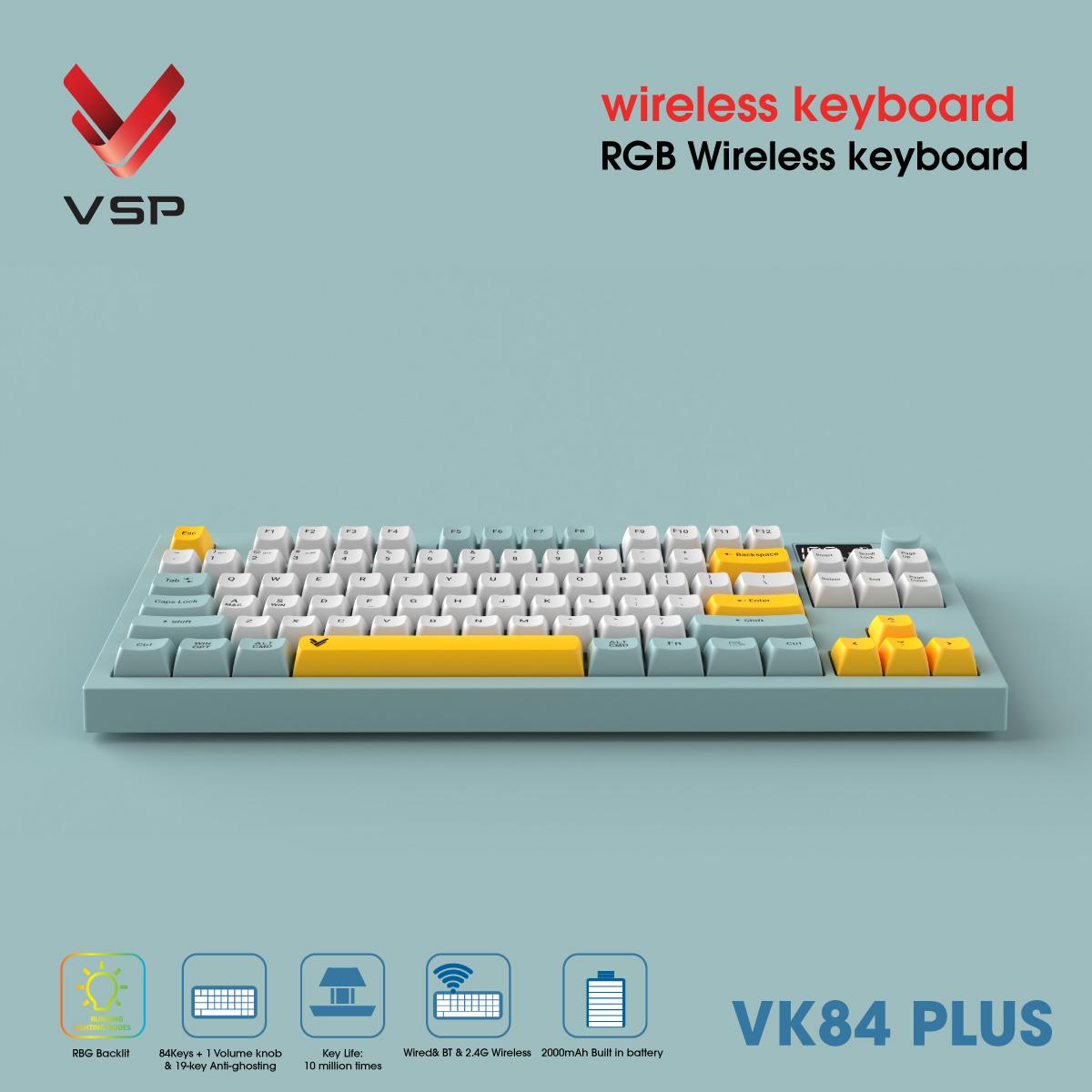VK84 Plus hỗ trợ có dây (USB), Bluetooth hai kênh và 2.4G Wireless. Người dùng có thể dễ dàng chuyển đổi nhanh chóng giữa nhiều thiết bị (PC, laptop, điện thoại, máy tính bảng) chỉ với một phím Fn.