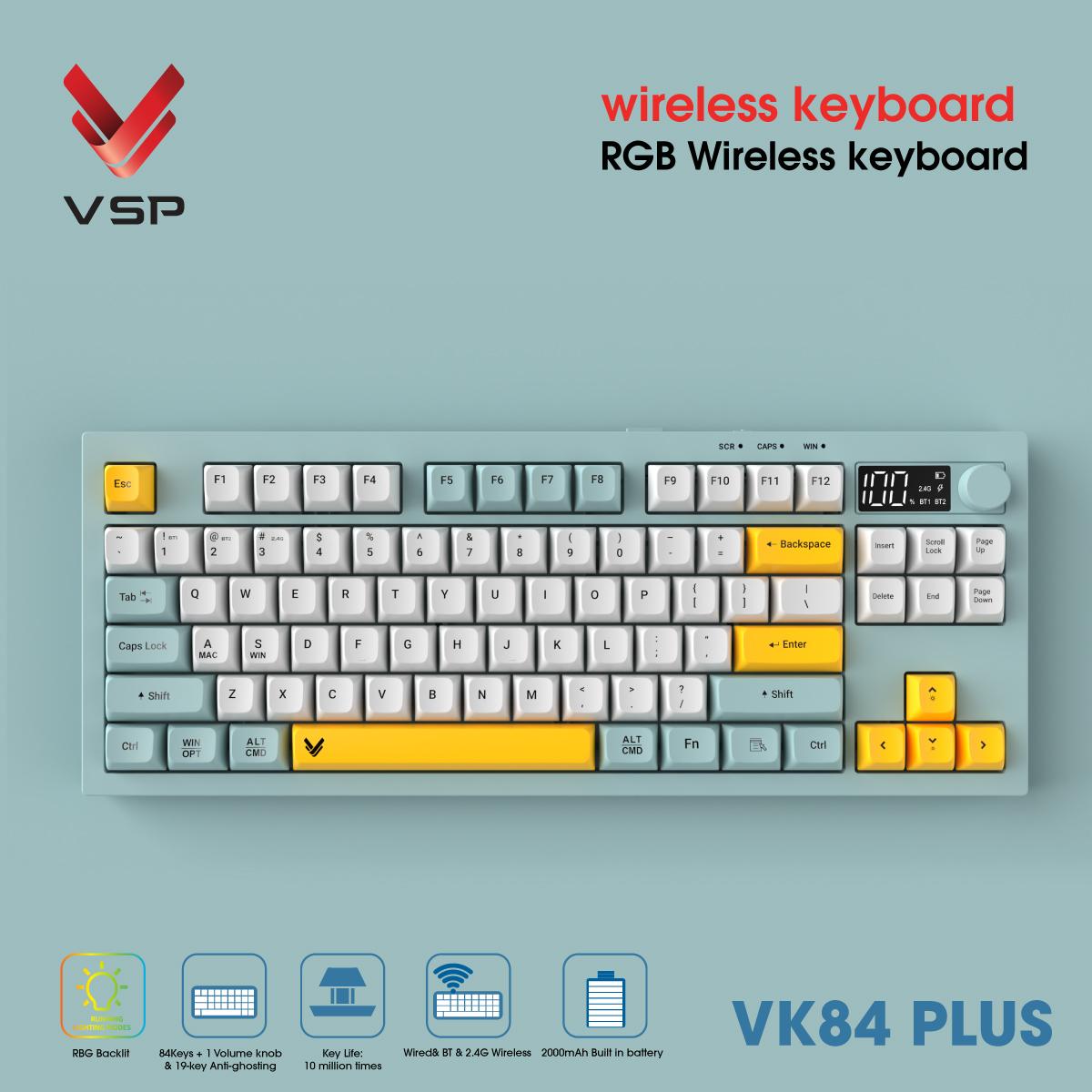 Bàn Phím Không Dây 3 Chế Độ VSP VK84 Plus là lựa chọn hoàn hảo dành cho game thủ hiện đại, khi gọn nhẹ và hiệu năng mạnh mẽ cùng hội tụ. Với thiết kế 84 phím dạng 75% nhỏ gọn, kết nối đa chế độ (USB, Bluetooth, 2.4G) và màn hình OLED thông minh, VK84 Plus không chỉ mang lại sự tiện lợi trong mọi hoàn cảnh, mà còn giúp bạn làm chủ tốc độ trong từng trận đấu. Thêm vào đó, bàn phím còn sở hữu đèn nền RGB đa màu, pin sạc bền bỉ và cảm giác gõ êm ái, đảm bảo cả phong cách lẫn hiệu năng cho mọi game thủ.