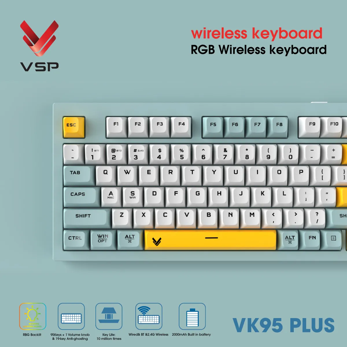 Với pin sạc dung lượng 2000mAh, VK95 Plus mang lại thời lượng pin dài, phù hợp cho cả ngày dài chơi game hoặc làm việc. Độ trễ thấp đảm bảo trải nghiệm gần như không khác biệt so với bàn phím có dây.