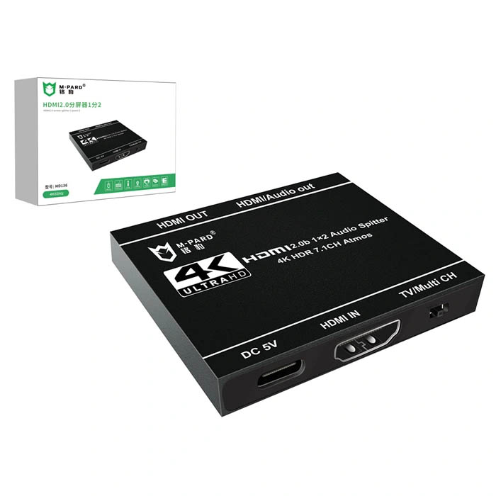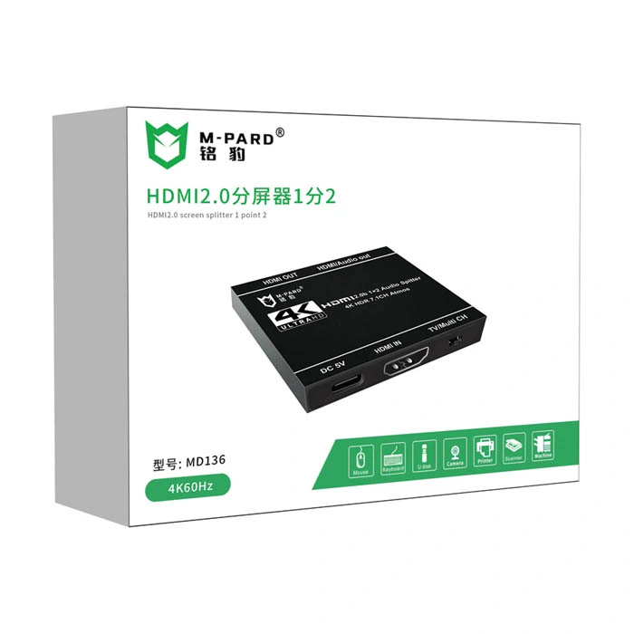 Bộ chia HDMI 1 ra 2 M-PARD MD136 là thiết bị chia tín hiệu hình ảnh/âm thanh từ 1 nguồn (máy tính, box tivi) ra 2 màn hình đồng thời, hỗ trợ độ phân giải cao 4K@60Hz, HDR, và tính năng hạ độ phân giải (downscaler) tự động, giúp hiển thị mượt mà trên cả màn hình 4K và 1080p. Sản phẩm có vỏ kim loại màu đen bền bỉ, sử dụng nguồn DC5V và hỗ trợ chuẩn HDMI 2.0/HDCP 2.2.