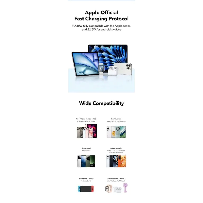 Tương thích đa dạng: Củ sạc tương thích với nhiều thiết bị hỗ trợ sạc USB-C như iPhone, iPad, các điện thoại Android (Samsung, Google Pixel, v.v.), tai nghe không dây, và các thiết bị hỗ trợ USB-C khác.