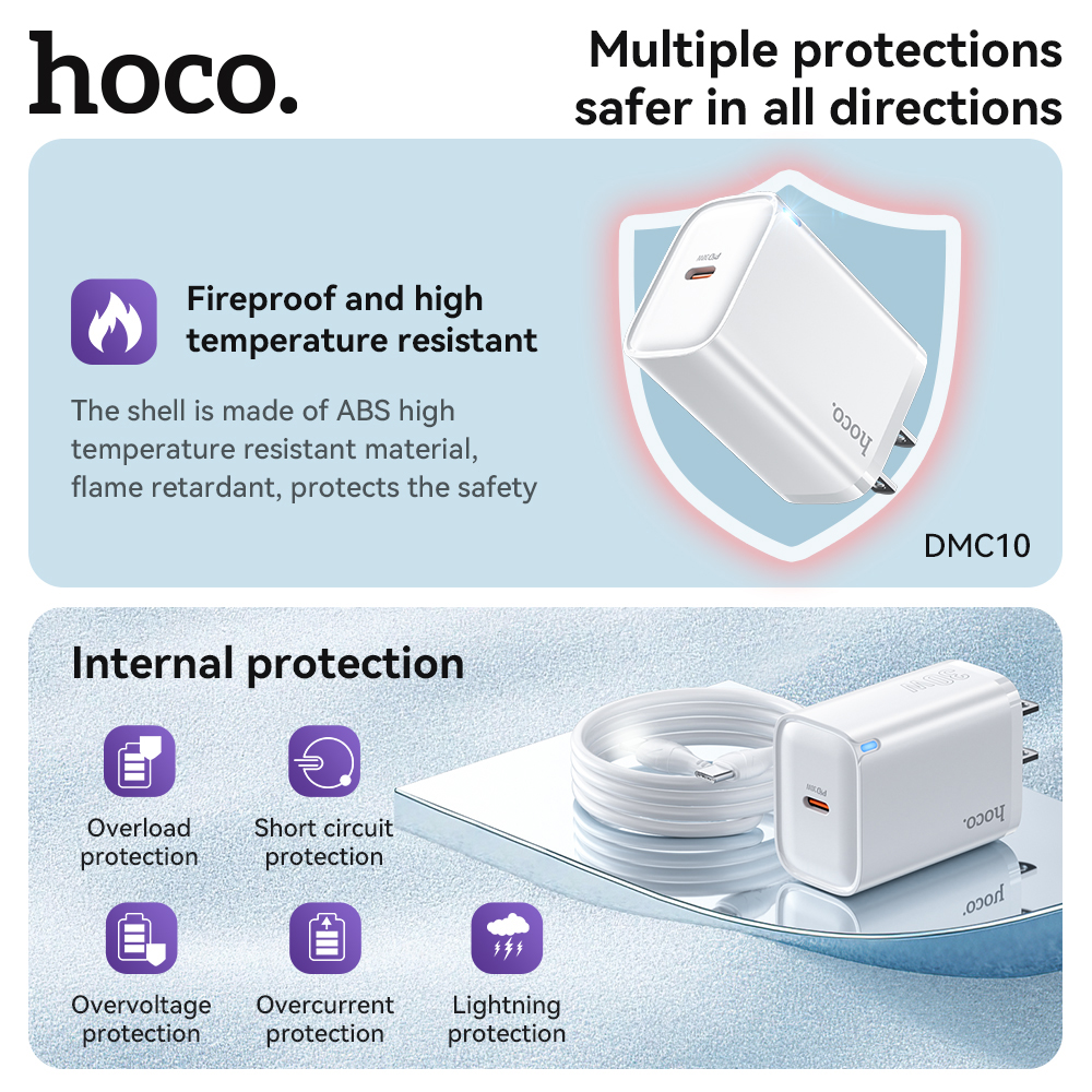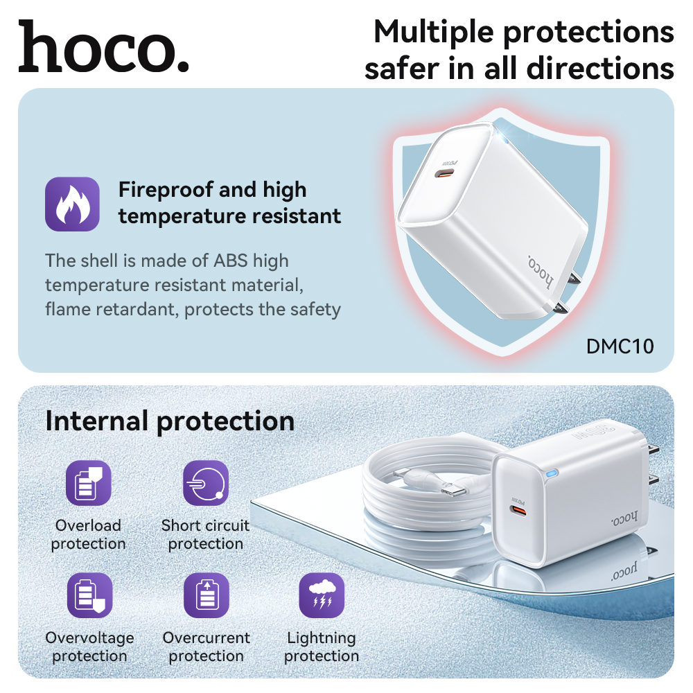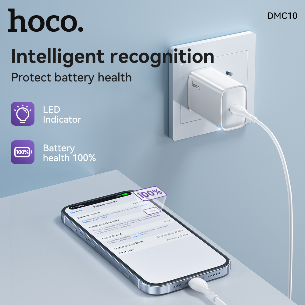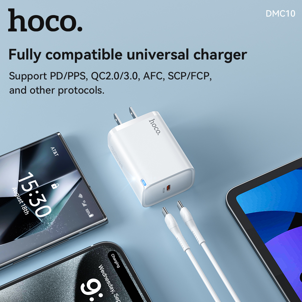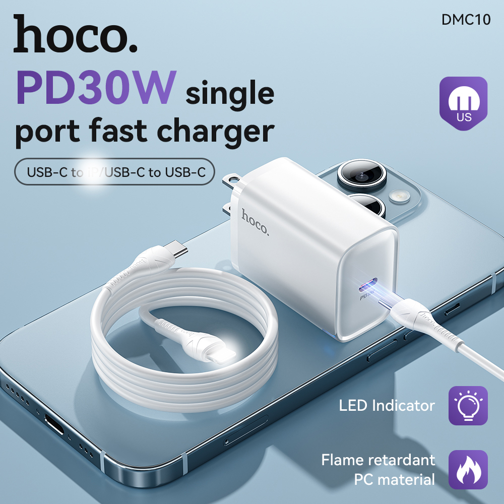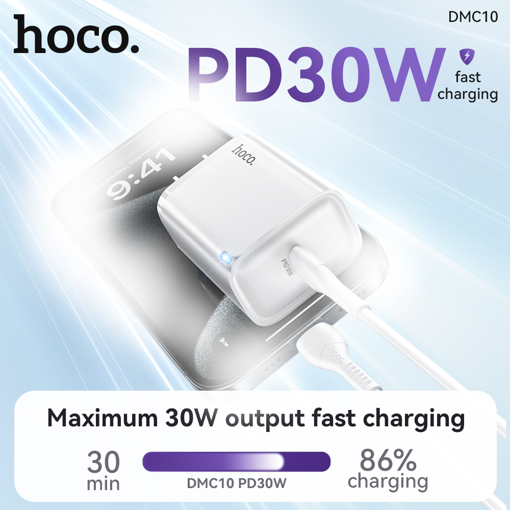Bộ sạc nhanh Hoco DMC10 TypeC PD/QC 30W, PPS 33W, Có đèn báo sạc, kèm cáp C to C / C to Lightning (Trắng)