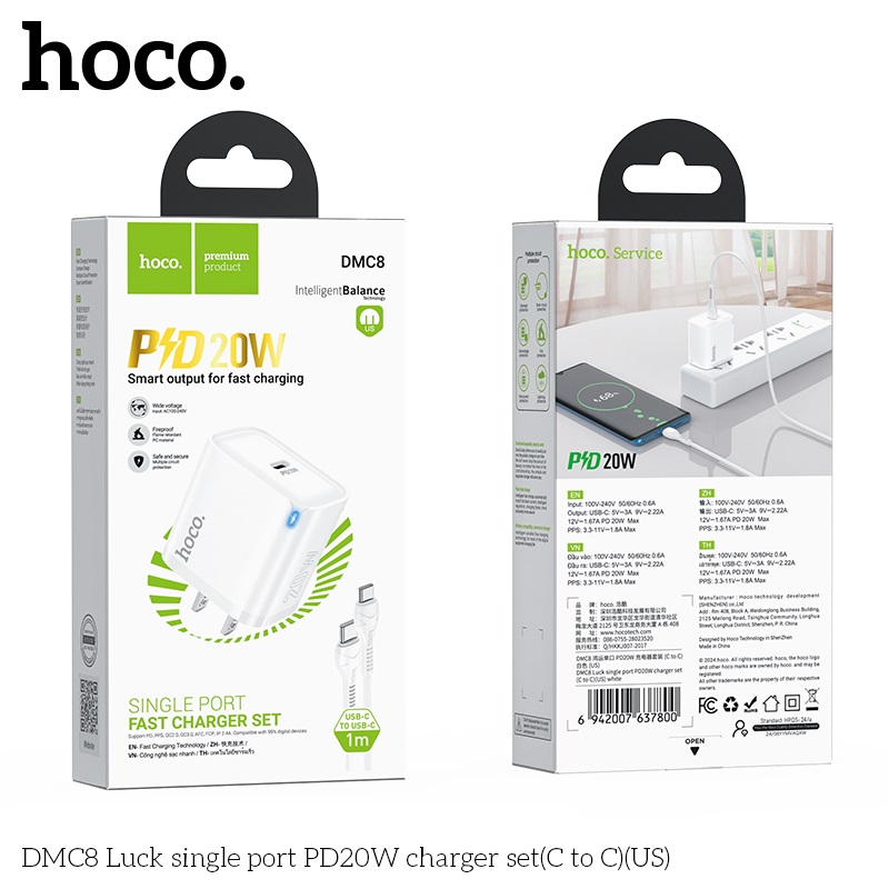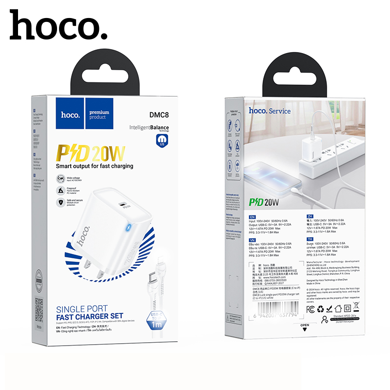 Bộ sạc nhanh Hoco DMC8 TypeC PD/QC/PPS 20W, Có đèn báo sạc, kèm cáp C to C / C to Lightning (Trắng)