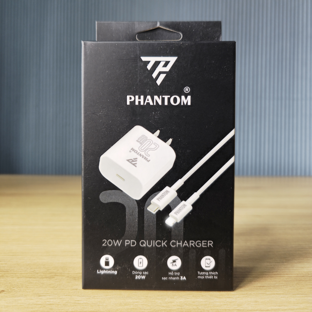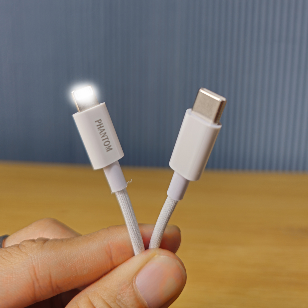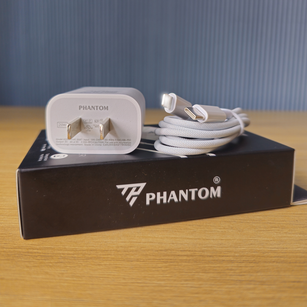 Bộ sạc nhanh Phantom PT5 TypeC to LN PD 20W, công nghệ GaN, Cáp dù dài 1M (Trắng)