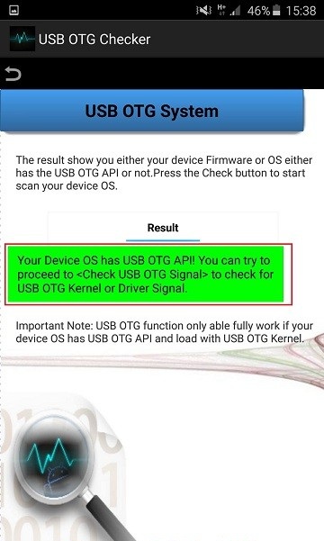 - Bước 4: Nếu kết quả hiện thị khung màu xanh như hình dưới, tức là điện thoại/ máy tính bảng của bạn có hỗ trợ kết nối OTG. Còn Ngược lại thì thiết bị của bạn sẽ không thể sử dụng chức năng OTG như các dòng sản phẩm khác.