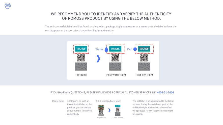 Đối với những sản phẩm và cách check trước đây là cào mã code sau đó nhập vào đường link trên trang chủ romoss, nhưng hiện tại nhà sản xuất romoss có thay đổi về cách để kiểm tra chính hãng trên tem chống giả và cách check này hãng cũng có thông báo trên trang chủ của họ, quy khách tham khảo video dưới đây để biết cách kiểm tra: