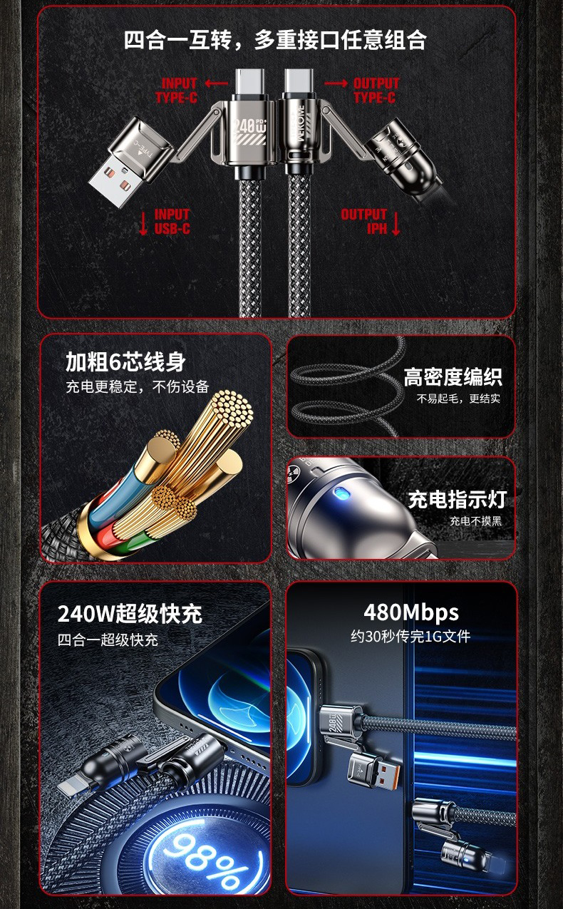 Cáp sạc 4in1 Wekome WDC-50 là lựa chọn hoàn hảo cho những ai muốn tiết kiệm không gian và thời gian khi sử dụng nhiều thiết bị di động. Với thiết kế đa năng, công suất truyền tải mạnh mẽ và chất liệu cao cấp, cáp sạc này mang lại trải nghiệm sạc nhanh chóng và an toàn cho các thiết bị của bạn. Hãy cùng khám phá những tính năng nổi bật của cáp sạc Wekome WDC-50..