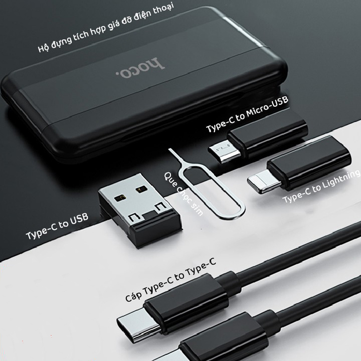 2. Bộ bao gồm: Cáp Type-C sang Type-C * 1, Bộ chuyển đổi Micro-USB sang Type-C * 1, Bộ chuyển đổi Lightning sang Type-C * 1, Bộ chuyển đổi USB sang Type-C * 1, Dụng cụ mở thẻ SIM * 1 .