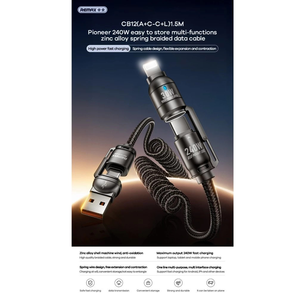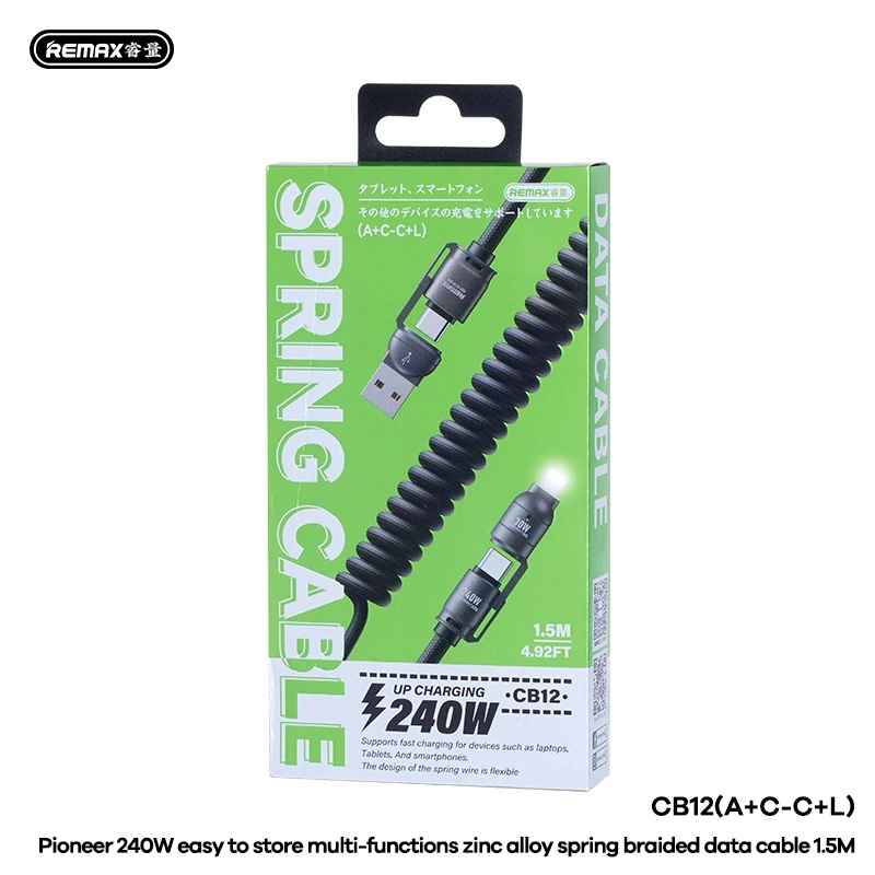 Cáp sạc REMAX Pioneer CB12 dài 1.5m được thiết kế dạng lò xo co giãn linh hoạt, giúp chống rối hiệu quả. Bọc dù chắc chắn, đầu cáp làm từ hợp kim kẽm cao cấp, chống gãy gập. Hỗ trợ truyền dữ liệu và sạc nhanh công suất lên đến 240W. Sản phẩm lý tưởng cho người dùng yêu cầu tốc độ cao và độ bền dài lâu..