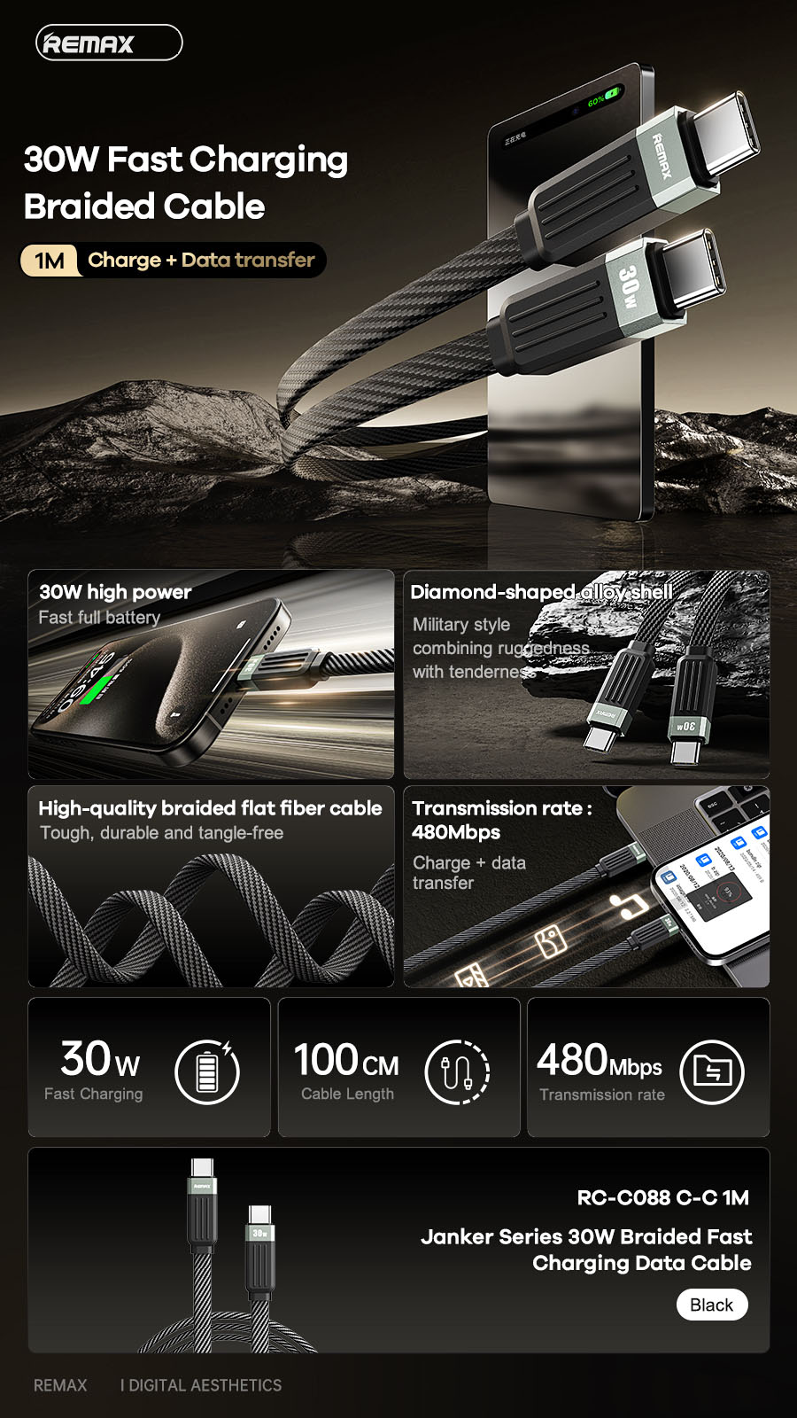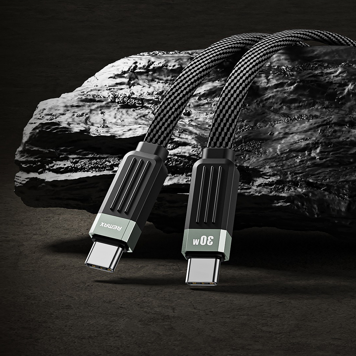 +Vỏ ngoài bện vải (braided) sợi fiber cao cấp, thiết kế dạng dây dẹt giúp chống rối và tăng độ bền.