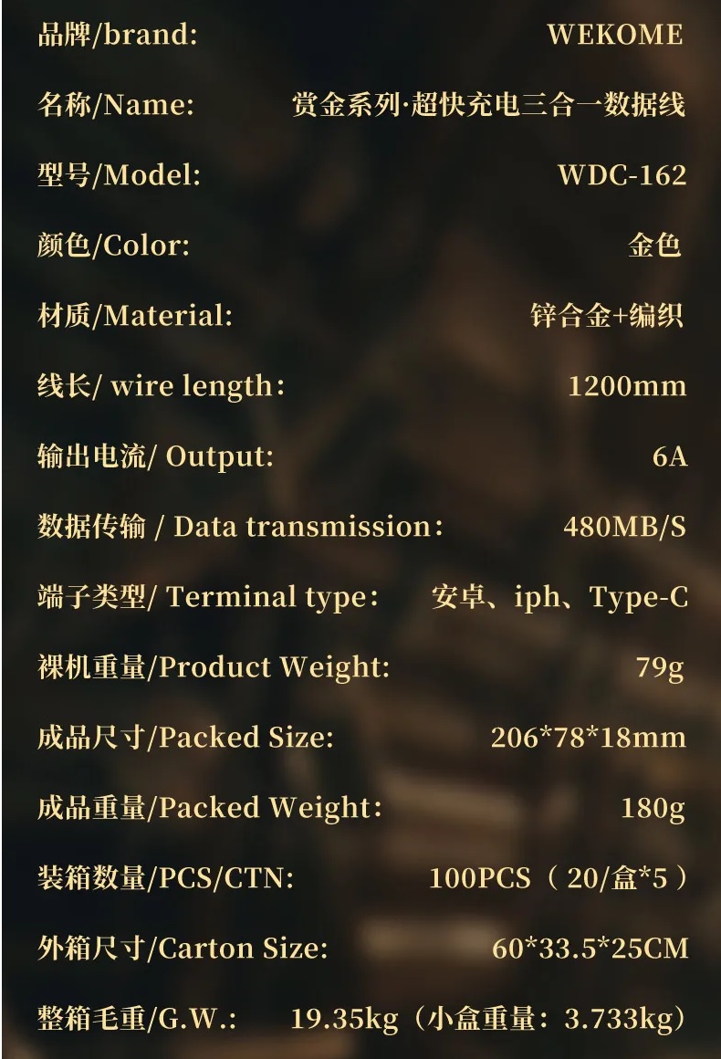 Cáp sạc nhanh 3in1 Wekome WDC-162th MicroUSB / Lightning / TypeC, Mạ vàng cực đẹp, Dài 1.2M