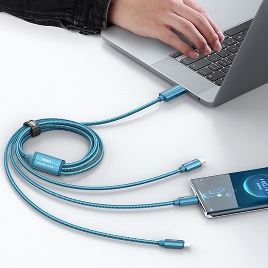 Với ba đầu sạc, cáp Remax RC-C012 hỗ trợ người dùng sạc cùng lúc 3 thiết bị vô cùng tiện lợi mà không nhiều diện tích trên ổ cắm điện. Chiếc cáp sạc đa năng này sở hữu công suất cực lớn lên tới 100W Max và tích hợp nhiều công nghệ sạc nhanh như PD, QC giúp tăng tốc độ, tiết kiệm thời gian sạc đáng kể.