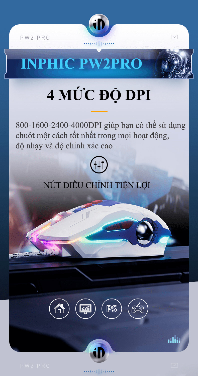 -Chuột chơi game có thể lập trình INPHIC, với các mức DPI cao: 800-1600-2400-4000. Tự do điều chỉnh, định vị chính xác hơn và phản ứng nhanh hơn. Khác thường, nó có hai chế độ làm việc, Chơi game trên PC và làm việc văn phòng, dễ dàng đáp ứng nhu cầu hoạt động hàng ngày của bạn.
