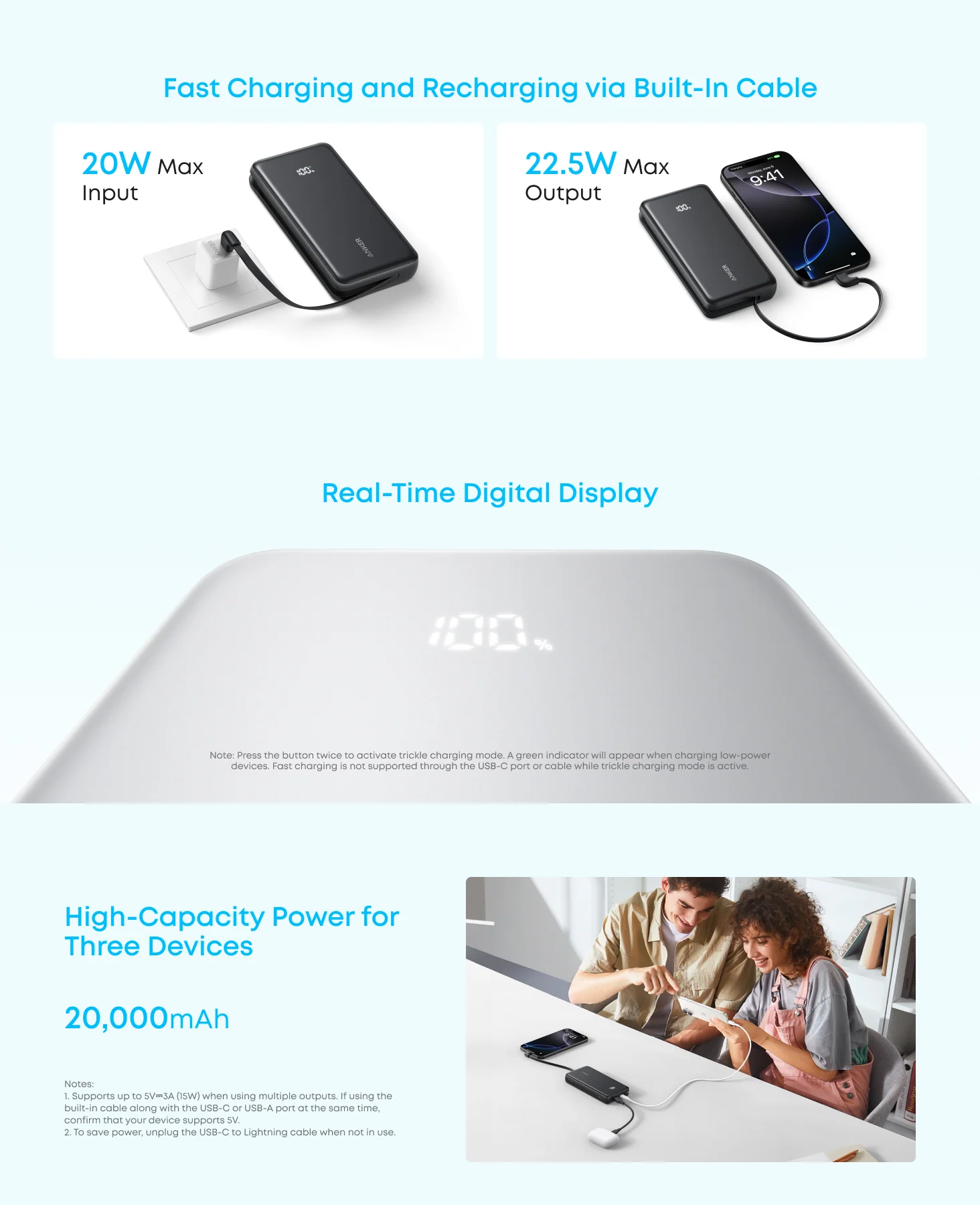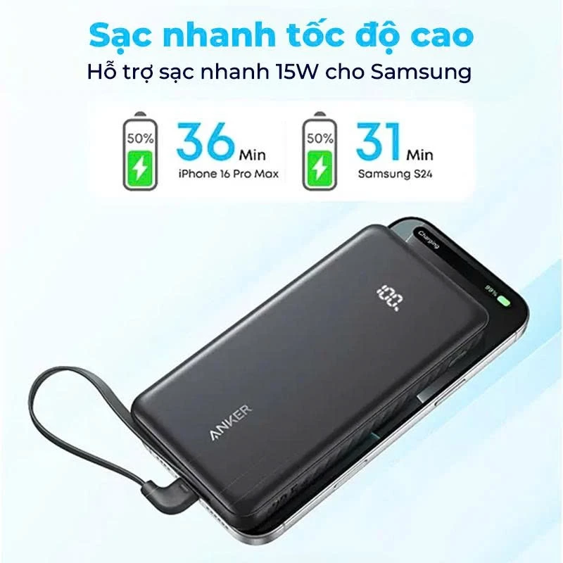 Đừng lãng phí thời gian chờ đợi. Công suất đầu ra tối đa 22.5W qua cổng USB-C và cáp tích hợp giúp sạc đầy các thiết bị tương thích trong thời gian ngắn kỷ lục. Trải nghiệm tốc độ sạc vượt trội, giúp điện thoại của bạn nhanh chóng quay lại hoạt động, đảm bảo bạn không bao giờ bị gián đoạn công việc hay giải trí.