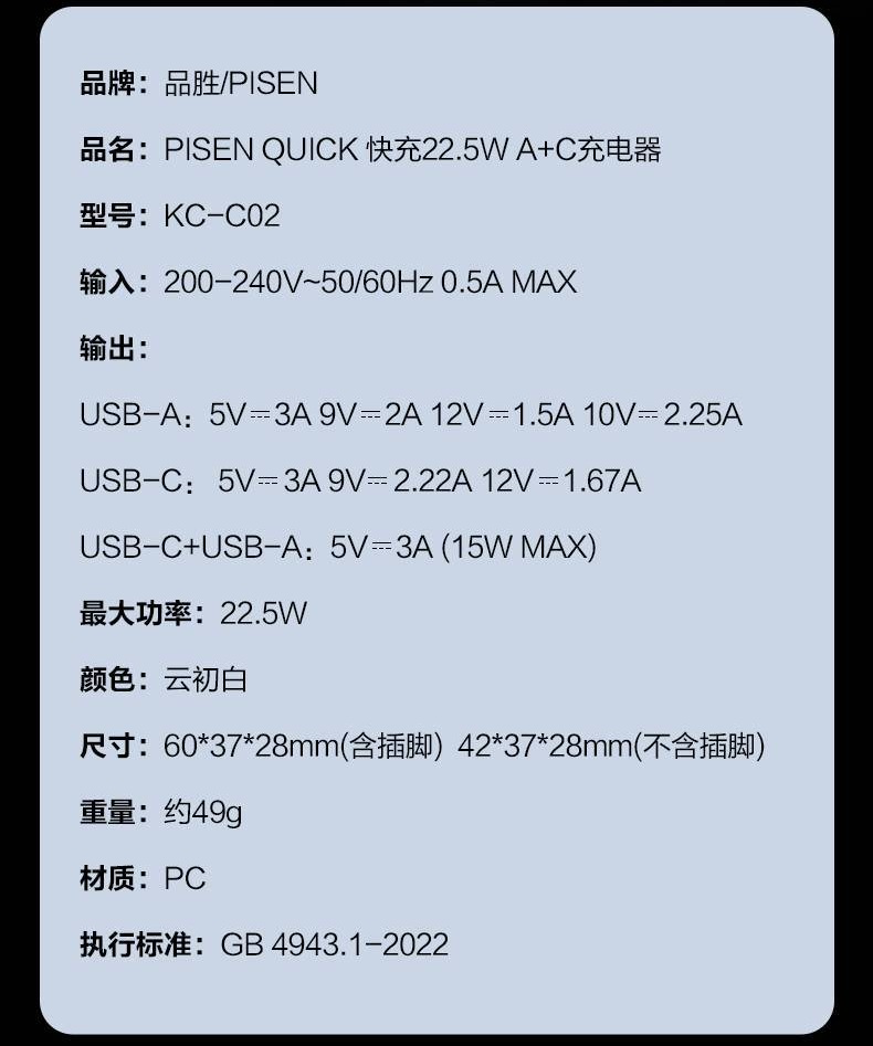 Type-C: 5V-3A, 9V-2A, 12V-1.5A, 10V-2.25A ~22.5W