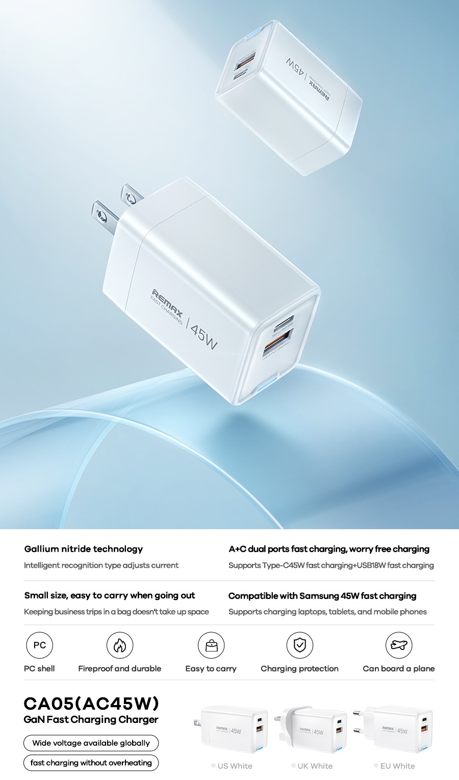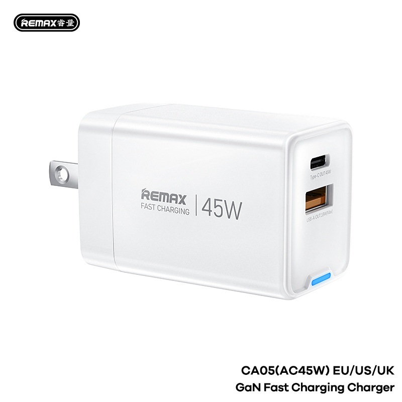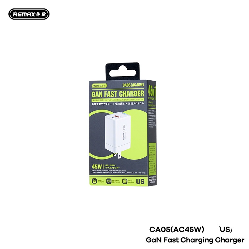 Đúng như tên gọi của nó, Remax CA05 (AC45W) được trang bị 2 cổng sạc: Type C và USB, cho phép người dùng có thể sạc được 2 thiết bị cùng lúc. Điểm đặc biệt là cả 2 cổng sạc này đều được tích hợp công nghệ sạc nhanh. Với cổng USB là công nghệ QC3.0 đến từ Qualcomm, còn cổng TypeC là công nghệ PD3.0. Với công nghệ sạc nhanh, củ sạc này có thể cho tốc độ sạc nhanh gấp 8 lần so với những củ sạc thông thường khác trên thị trường.Sản phẩm có thể đáp ứng nhiều dòng ra khác nhau, tùy theo nhu cầu sử dụng của người dùng.