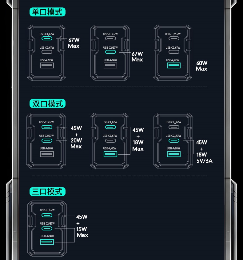 TYPE-C1 & (C2+USB-A): 45W+15W