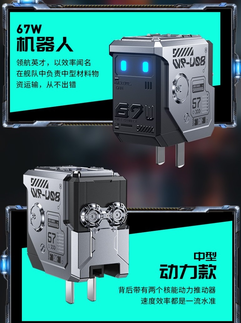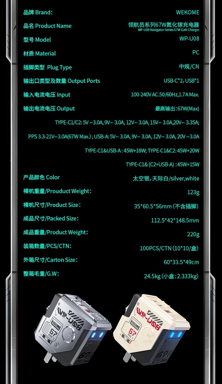 Cốc sạc nhanh 3 cổng Wekome WP-U08 chân gập US, 2 cổng TypeC + 1 cổng USB Max 67W, vật liệu GaN