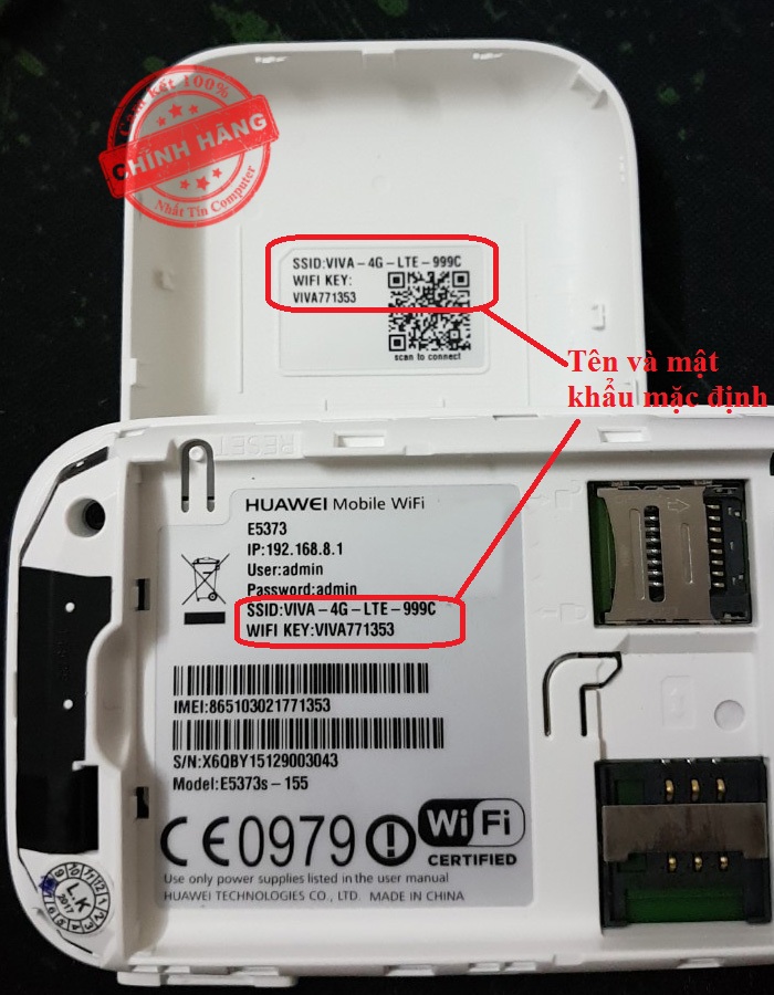 Quý khách kết nối với thiết bị wifi bằng tên và mật khẩu mặc định được in trên nắp lưng máy hoặc trên màn hình LCD (với các bộ phát có màn hình hiển thị), dưới đây là hình minh họa tùy vào sản phẩm sẽ có tên và mật khẩu khác nhau: