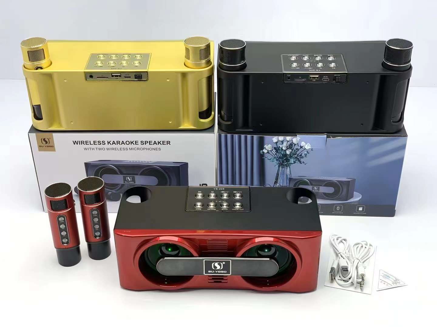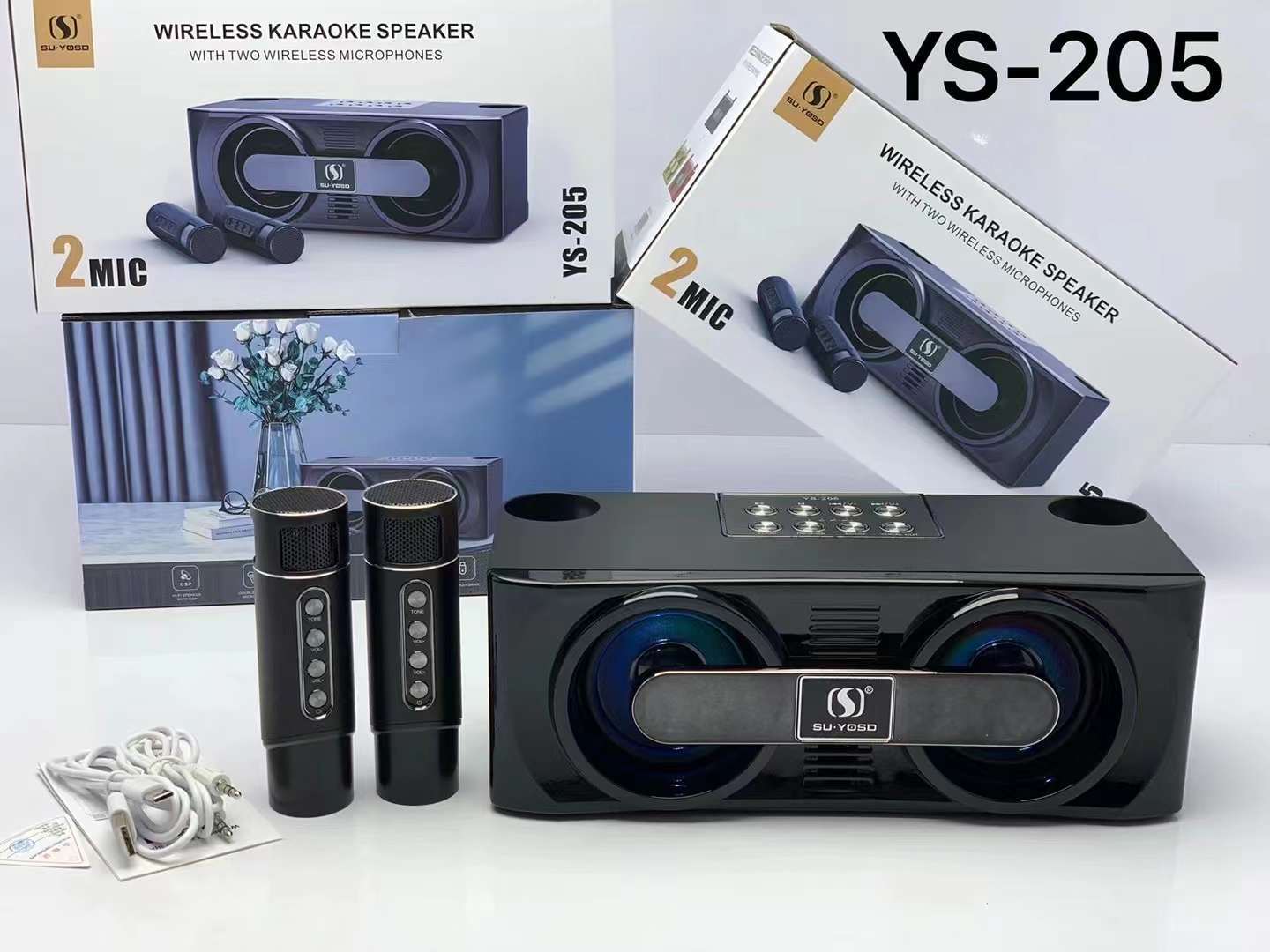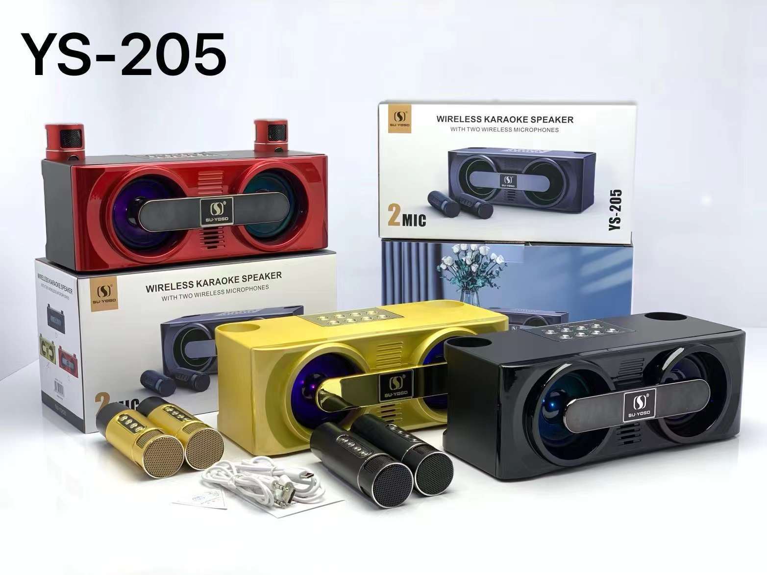 Bộ sản phẩm loa di động YS- 205 là một trong số ít những loa karaoke mini được tặng kèm 2 micro không dây có giá thị trường dưới 1 triệu đồng. 2 chiếc micro không dây có màu vàng đặc sắc, đặc biệt là không dùng pin AA như nhiều micro tặng kèm khác mà sử dụng điện sạc DC 5V.