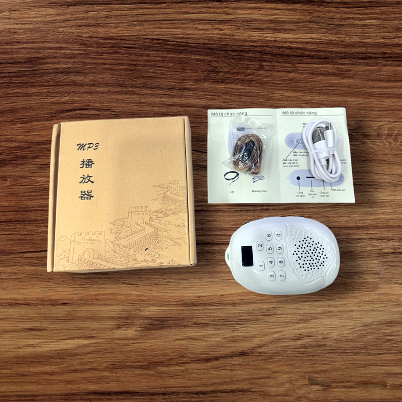 ● Chức năng: nghe kinh - niệm phật - có sẵn bài kinh (51 bài mặc định) - cổng cắm tai nghe - khe gắn thẻ nhớ - màn hình hiển thị