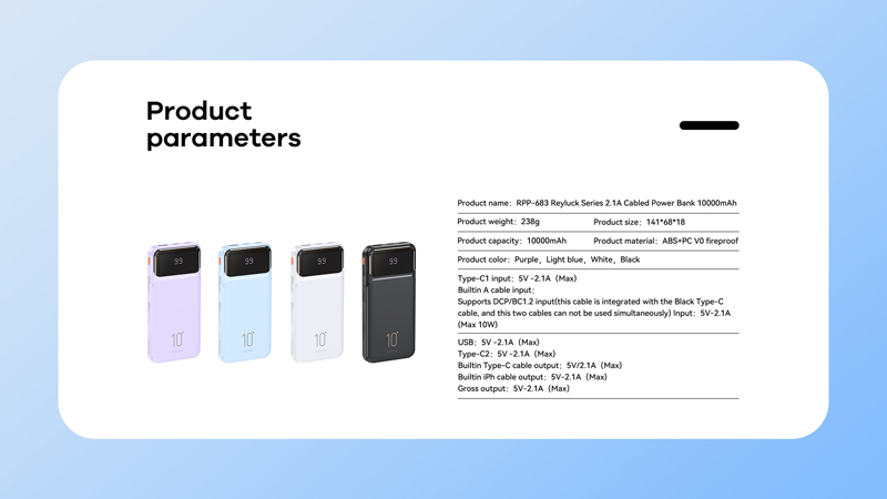 Pin sạc dự phòng 10000mAh Remax RPP-683 sử dụng lõi thế hệ mới Lithium Polymer với kích thước 141*68*18mm cùng trọng lượng chỉ 238g.