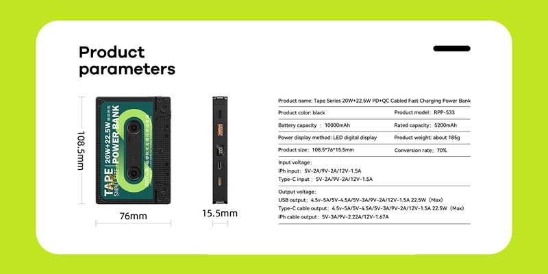 Remax RPP-533 tích hợp tổng 5 cổng sạc gồm: Cáp sạc nhanh typeC QC max 22.5W (cho andoird và sạc được cả iTáo 15), cáp sạc nhanh LN iTáo PD 20W (dành iTáo từ 14 prm trở xuống), 1 cổng USB sạc ra max 22.5W, 2 cổng sạc vào pin là LN và typeC đều hỗ trợ sạc nhanh vào 18W.