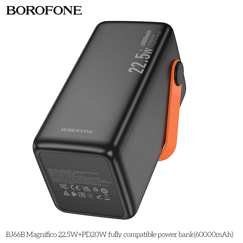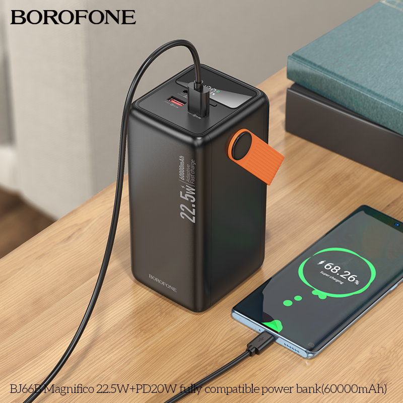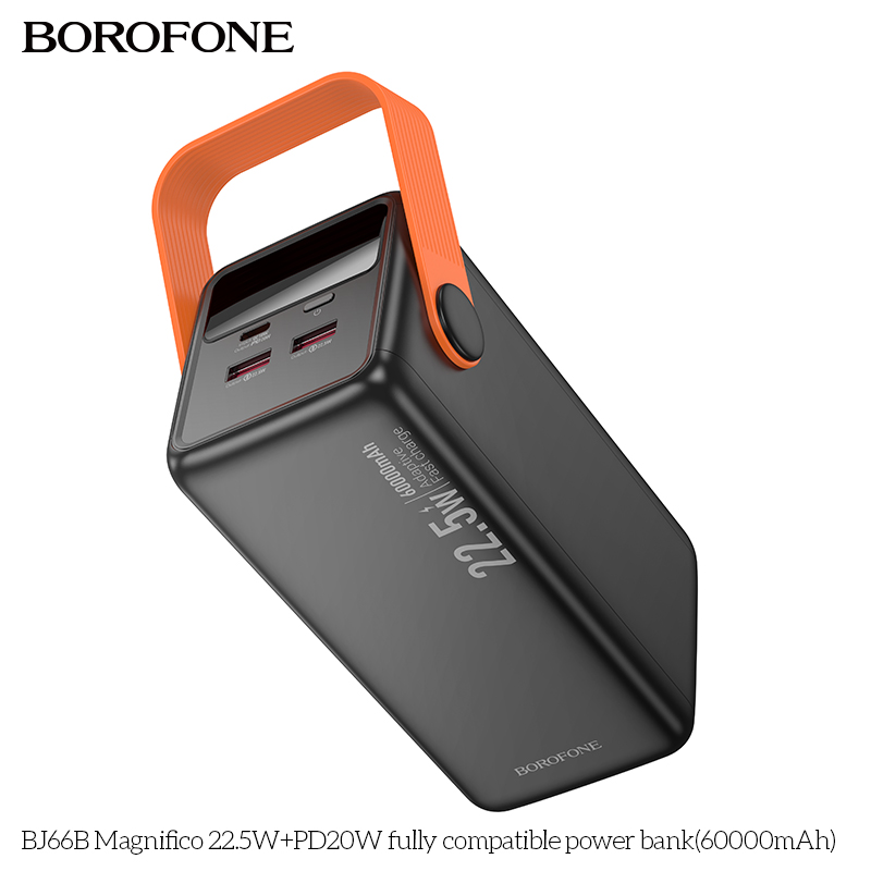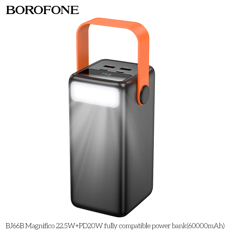 Pin sạc dự phòng Borofone BJ66B với dung lượng60.000mAh là lựa chọn lý tưởng cho những ai cần nguồn điện dự phòng mạnh mẽ và bền bỉ. Sản phẩm không chỉ mang đến khả năng sạc nhanh với công suất lên đến 22.5W, mà còn tích hợp màn hình LED kỹ thuật số thông minh, giúp người dùng dễ dàng theo dõi mức năng lượng còn lại. Với thiết kế nhỏ gọn và chất liệu cao cấp, Borofone BJ66B sẽ là người bạn đồng hành tin cậy cho những chuyến đi dài hay những ngày làm việc bận rộn.