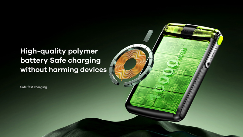 Thân pin được làm bằng chất liệu PC - V0 (chống cháy nổ) có độ bền cao, khả năng chịu lực tốt, chống mài mòn hiệu quả. Đặc biệt thiết kế phần trên trong suốt khá lạ mắt, có tích hợp bên trong màn hình hiển thị % pin.