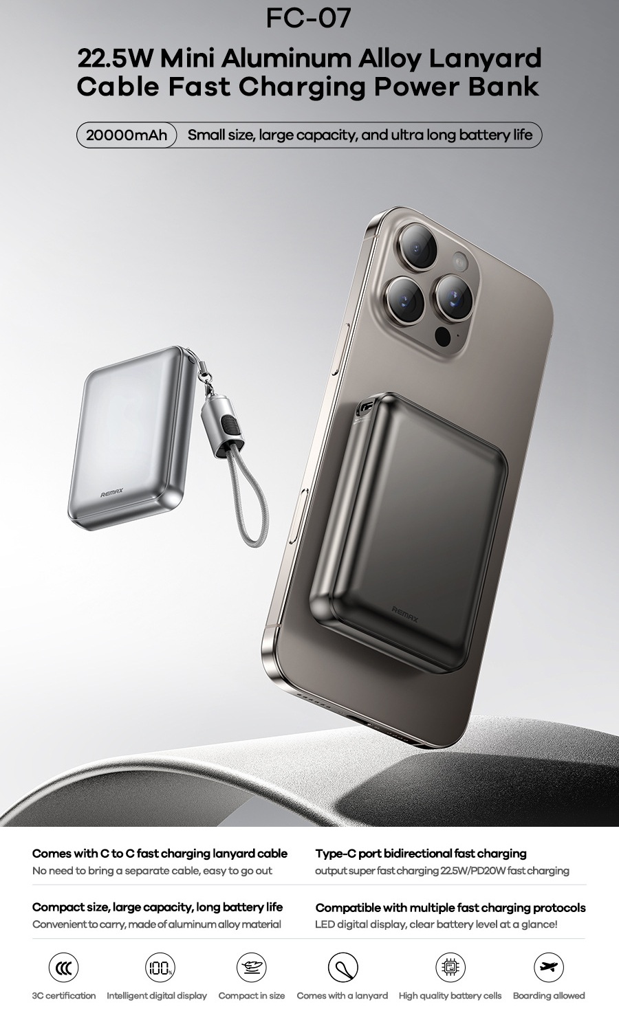 Pin dự phòng mini REMAX FC-07 20000mAh TypeC PD 22.5W, Kèm cáp C to C ngắn, Thiết kế siêu nhỏ
