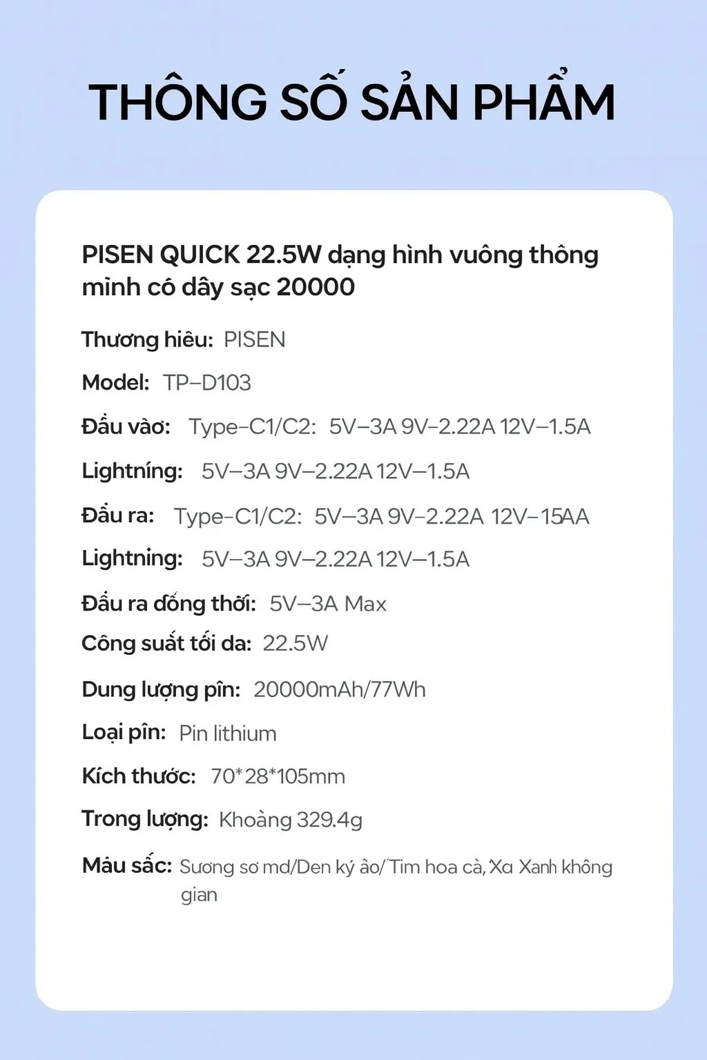 Cổng USB-A: 5V-3A, 9V-2A, 10V-2.25A, 12V-1.5A ~22.5W
