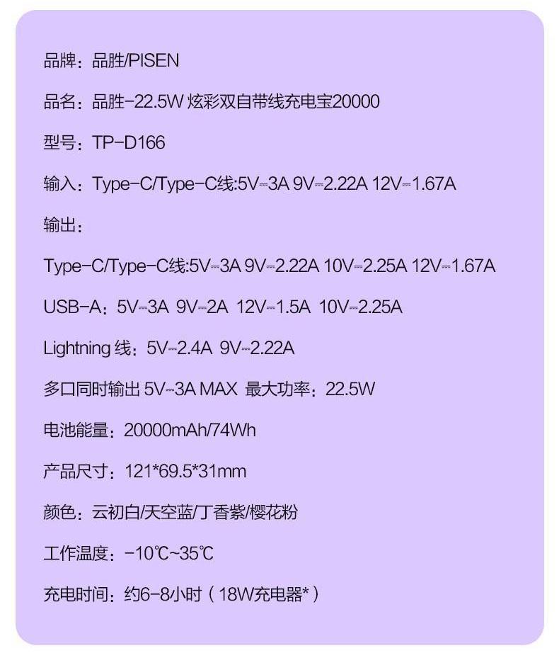 Cổng USB-A: 5V-3A, 9V-2A, 10V-2.25A, 12V-1.5A ~22.5W