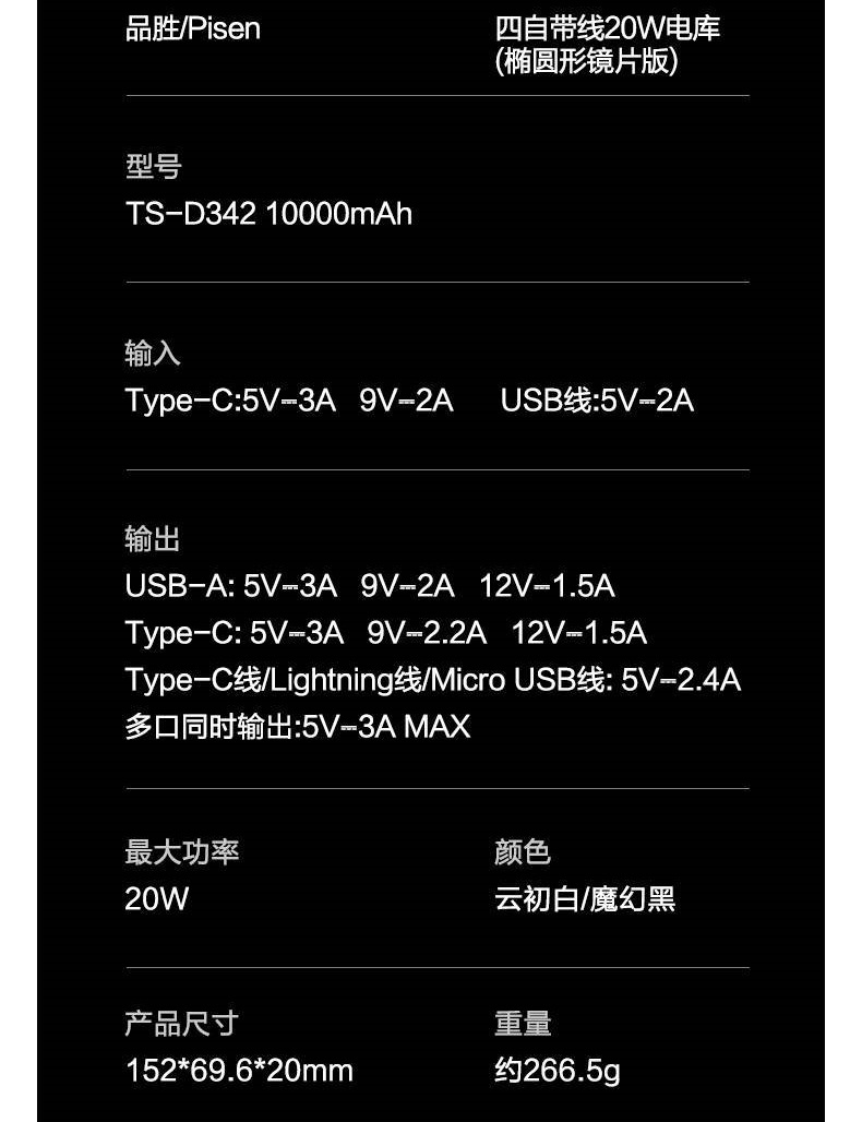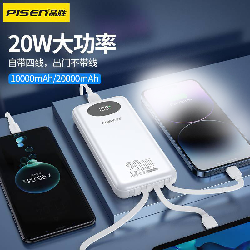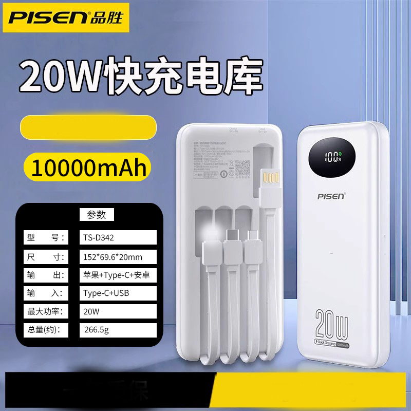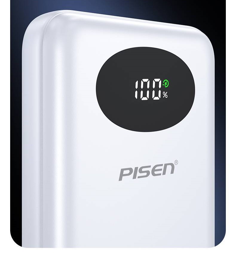 Pin dự phòng Pisen TS-D342A 10.000mAh TypeC PD 20W, USB-A QC 18W, Kèm 4 cáp sạc, Màn hình LCD (Trắng)