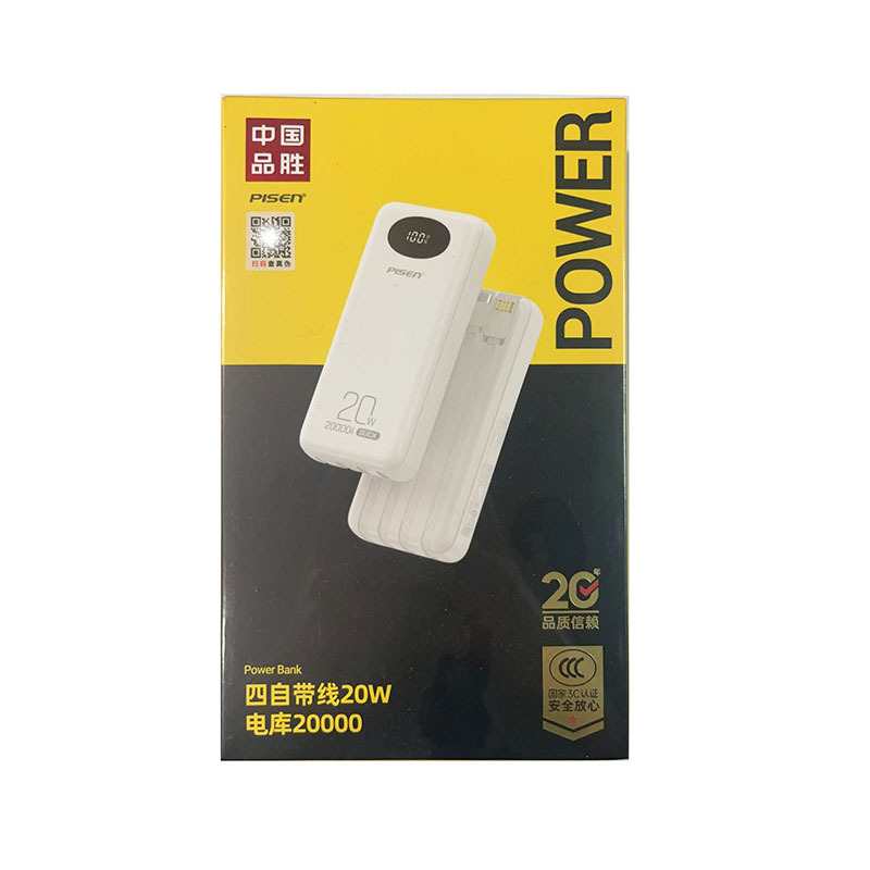 Pin dự phòng Pisen TS-D344 20.000mAh TypeC PD 20W, Kèm 4 cáp sạc, Màn hình LCD (Trắng)
