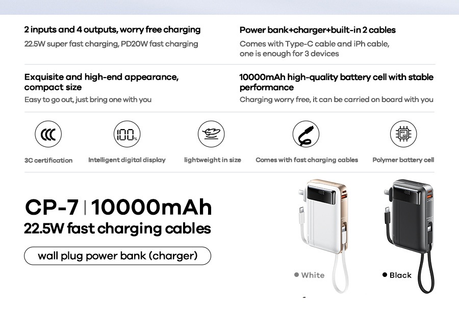 2. Đi kèm với phích cắm AC có thể gập lại, cáp Type-C và cáp iPh, giúp bạn dễ dàng ra ngoài mà không cần mang theo bộ sạc hoặc cáp sạc;