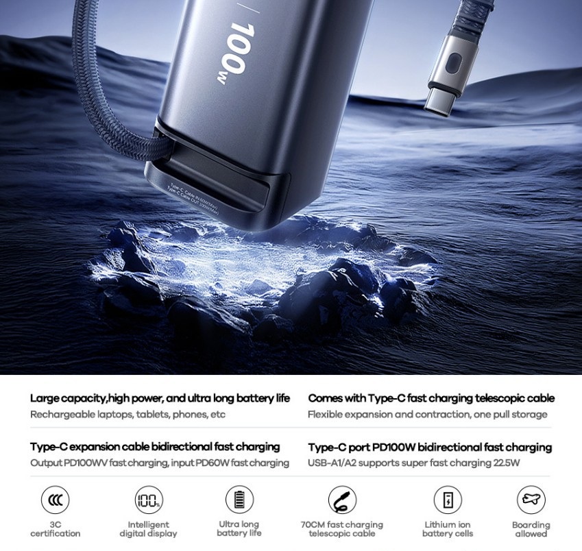1. Dung lượng lớn, công suất cao và thời lượng pin cực dài; Đi kèm cáp sạc nhanh Type-C dạng ống lồng dài 70CM, có thể dễ dàng kéo dài và thu gọn, phù hợp với nhiều trường hợp, không cần thêm cáp khi ra ngoài, giúp đơn giản hóa quá trình di chuyển.