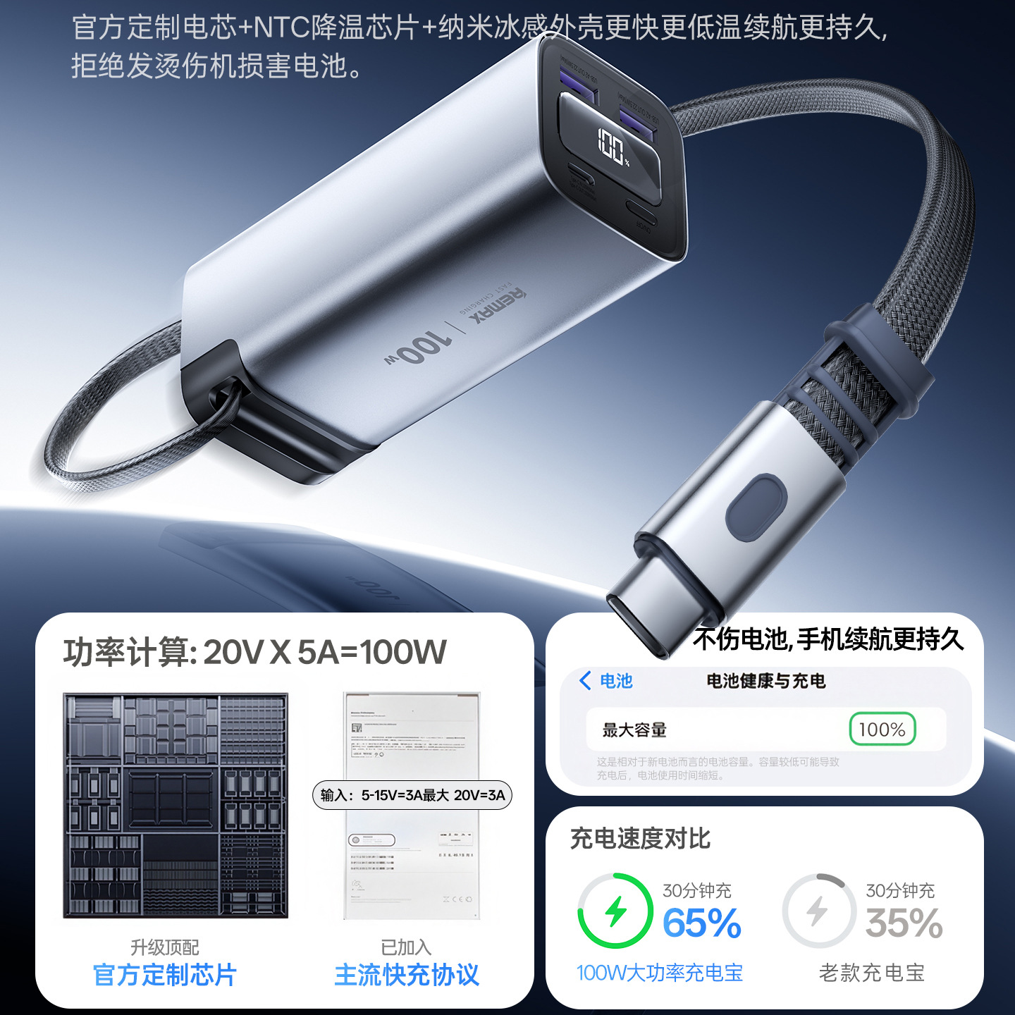 2. Cáp Type-C dạng ống lồng hỗ trợ sạc nhanh hai chiều, với đầu vào sạc nhanh PD60W và đầu ra sạc nhanh PD100W.