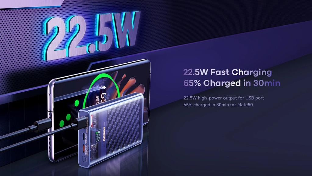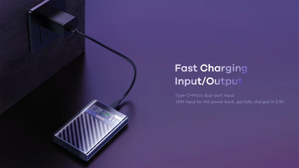 Pin sạc dự phòng 10000mah RPP-551 với thiết kế bề mặt trong suốt hiện rõ các vân carbon bên trong, với lõi pin polymer thế hệ mới với kích thước viên pin 94 x 61 x 22.5mm cùng trọng lượng 190g.
