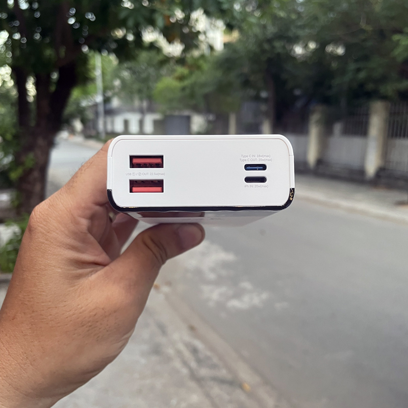 Trên pin dự phòng tích hợp 3 cổng sạc bao gồm: 1 cổng LN in, 1 cổng typeC in/out (đảo chiều PD 20W) và 2 cổng USB (QC 22.5W). Giúp rút ngắn thời gian sạc đầy giúp đảm bảo cung cấp năng lượng cho thiết bị của bạn một cách tiện lợi nhất.