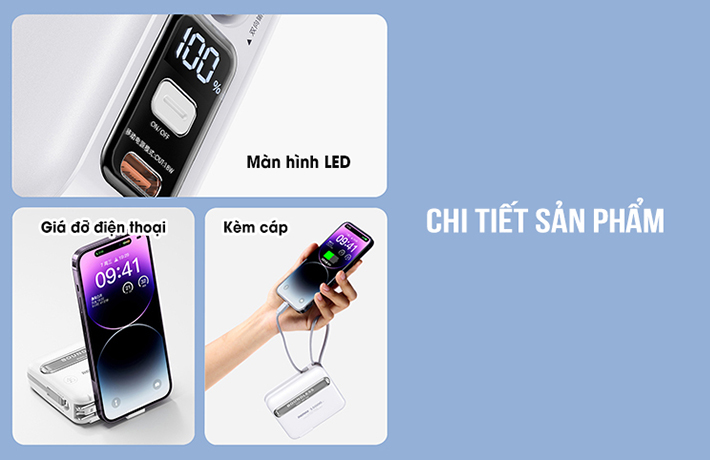 ● Chức năng: Quick charge 45W - Power Delivery 45W và 18W - cáp sạc tích hợp - màn hình LCD - sạc nhiều thiết bị - sạc cho laptop - tích hợp giá đỡ điện thoại