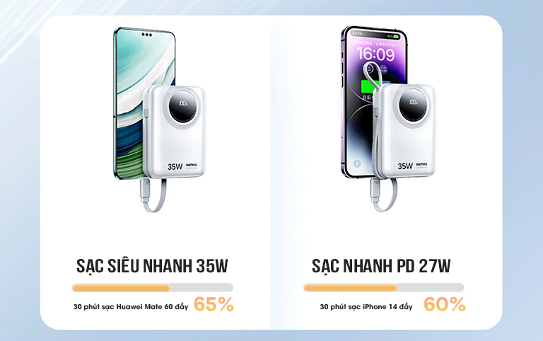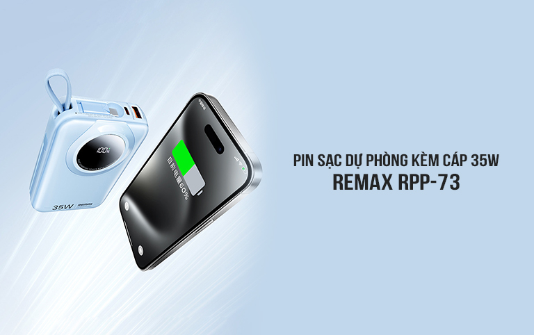 Pin sạc dự phòng kèm cáp Remax RPP-73 được trang bị công suất lớn lên đến 35W cho khả năng sạc nhanh các thiết bị di động từ smartphone, tablet đến laptop và tương thích với các giao thức PD, QC, SCP, FCP,...