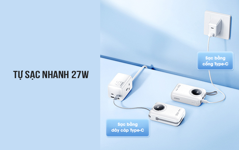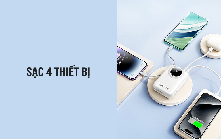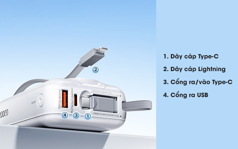 RPP-73 đã tích hợp 2 cáp sạc: LN cho iTáo 14 prm trở xuống (max 27W) và TypeC (max 35W) đi kèm. Trong đó cáp TypeC vừa hỗ trợ In/ Output vô cùng tiện lợi, ngoài ra còn thêm cổng typeC cũng hỗ trợ tương tự in/output (max 35W), và cuối cùng là cổng USB sạc out (max 22.5W). Đặc biệt, pin hỗ trợ sạc hầu hết các dòng iTáo hiện nay trên thị trường, với cổng typeC và cáp typeC đều hỗ trợ sạc được iTáo 15, còn nếu người dùng sử dụng iTáo 14 prm trở xuống thì có thể sạc bằng cổng LN. Sạc cùng lúc 4 thiết bị.