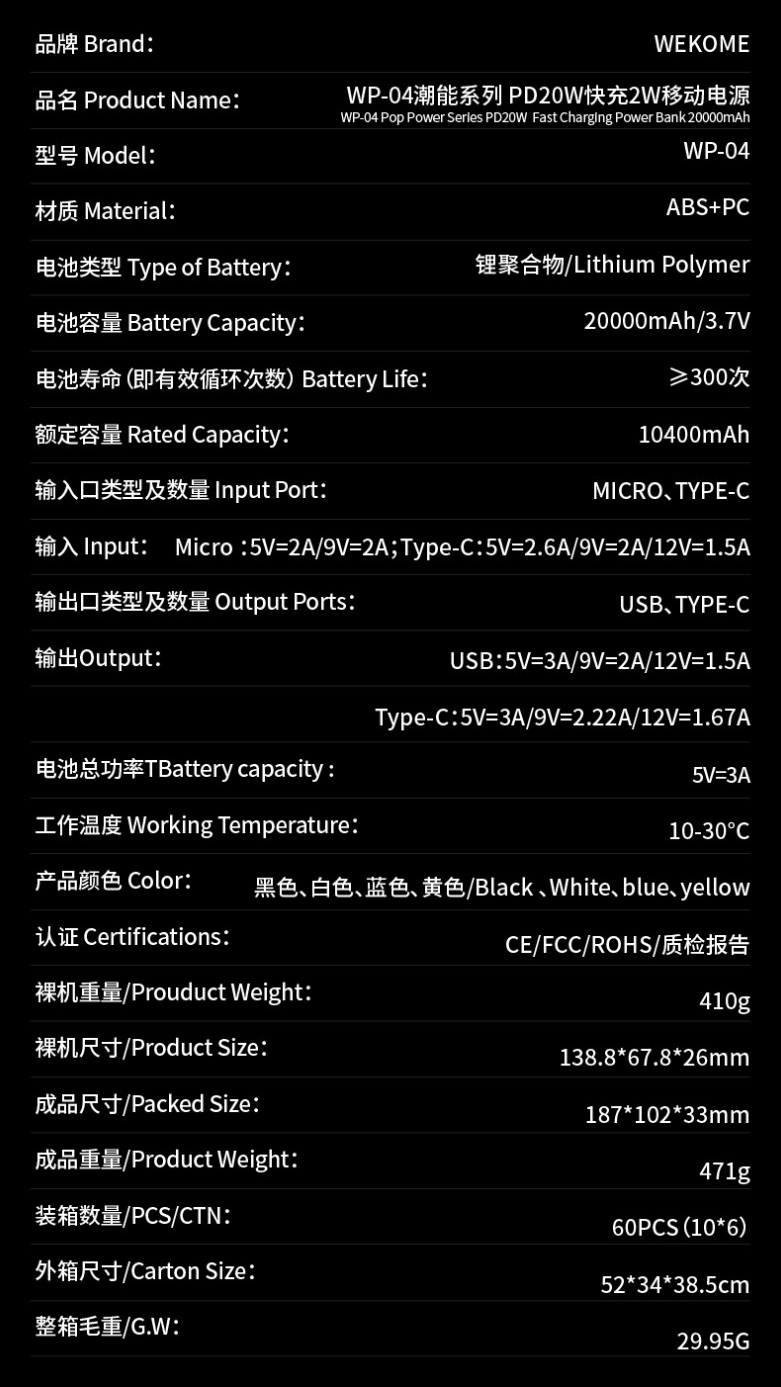 WP-04 sở hữu pin lithium polymer có dung lượng 20,000mAh, đủ để sạc nhiều lần cho điện thoại thông minh hoặc các thiết bị khác. Với tuổi thọ pin lên đến ≥300 lần sạc, bạn có thể sử dụng sản phẩm trong thời gian dài mà không phải lo lắng về việc thay thế pin. Dung lượng định mức 10,400mAh đảm bảo cung cấp năng lượng ổn định và đáng tin cậy cho các thiết bị di động.