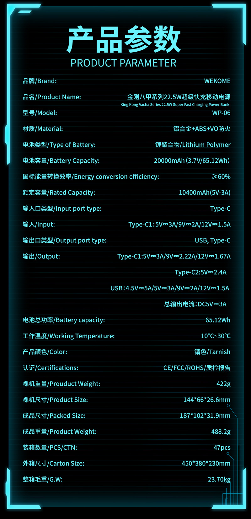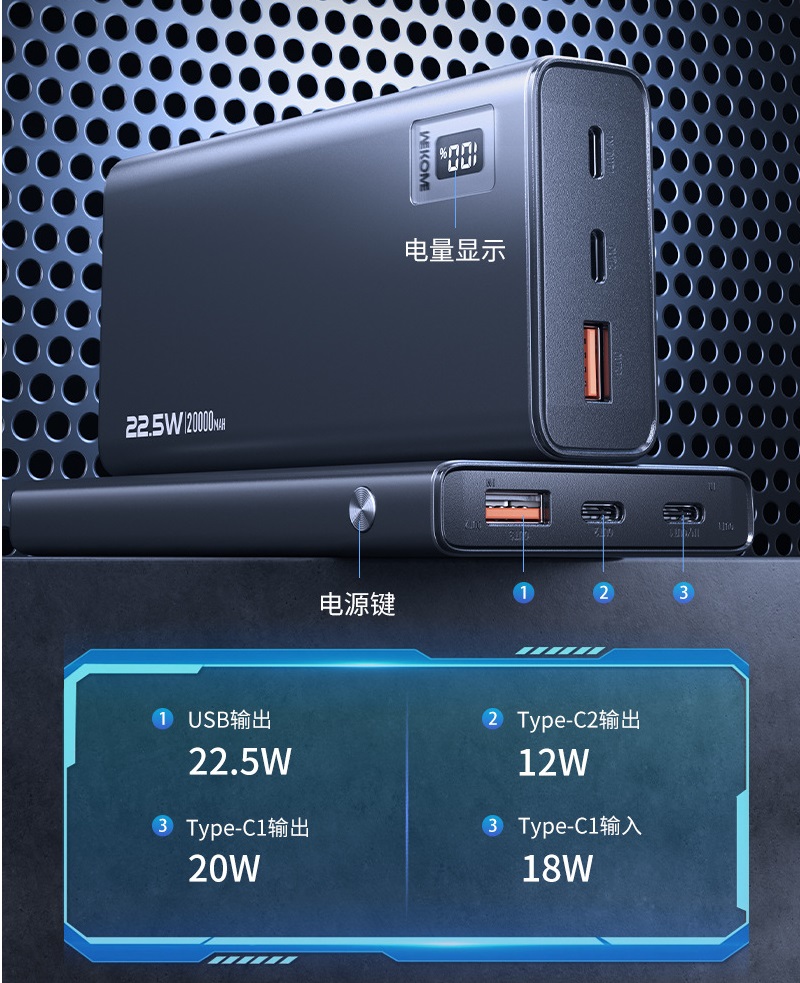 Pin sạc dự phòng Wekome WP-06 có điểm mạnh là dung lượng pin tới 20.000mAh, đảm bảo cung cấp pin cho điện thoại, máy tính bảng và các thiết bị điện tử khác khi cần thiết.