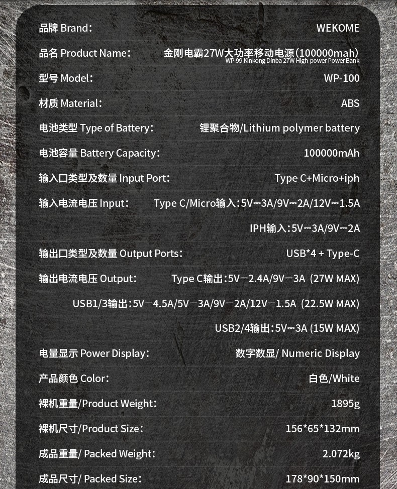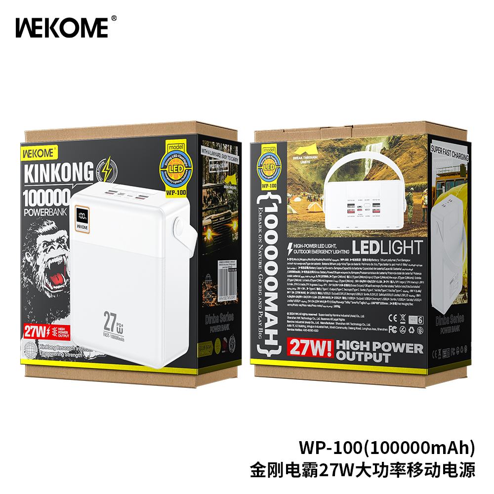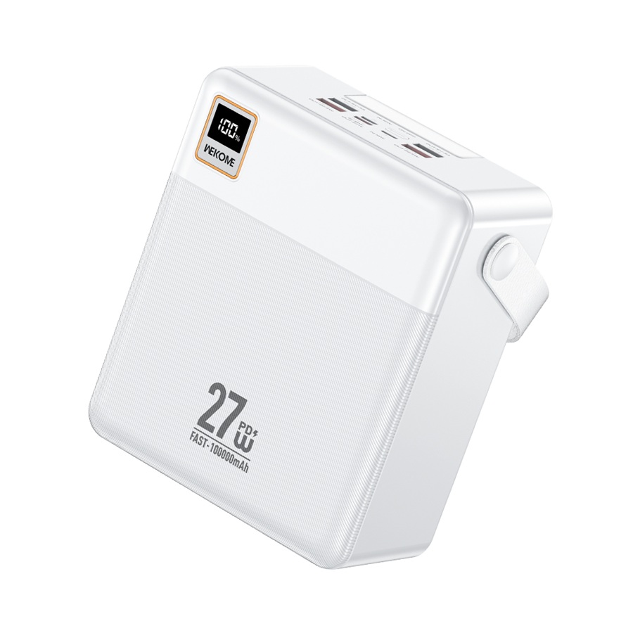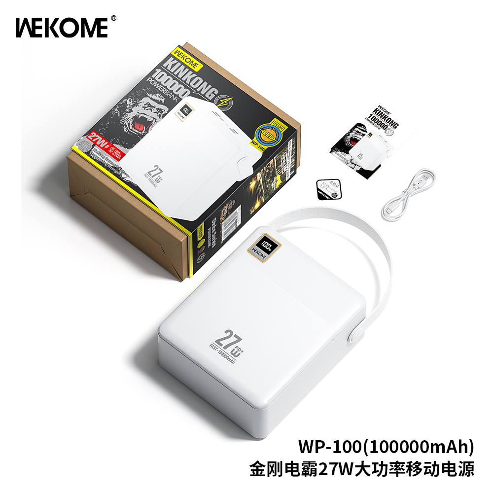Pin dự phòng Wekome WP-100 100000mAh TypeC PD 27W, 4 USB-A max 22.5W, 3 cổng Input, Có Đèn Led (Trắng)