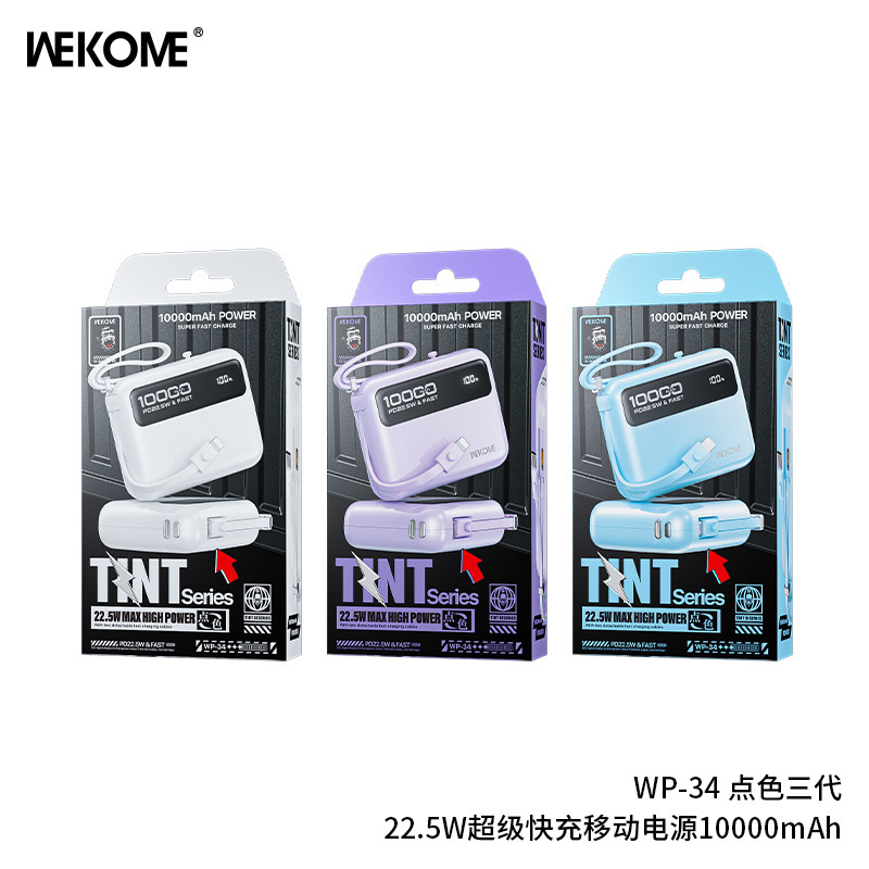 Pin dự phòng WEKOME WP-34 10000mAh USB QC 3.0 22.5W, TypeC PD 20W, Kèm 2 cáp sạc, Cell Pin Li-ion 21700
