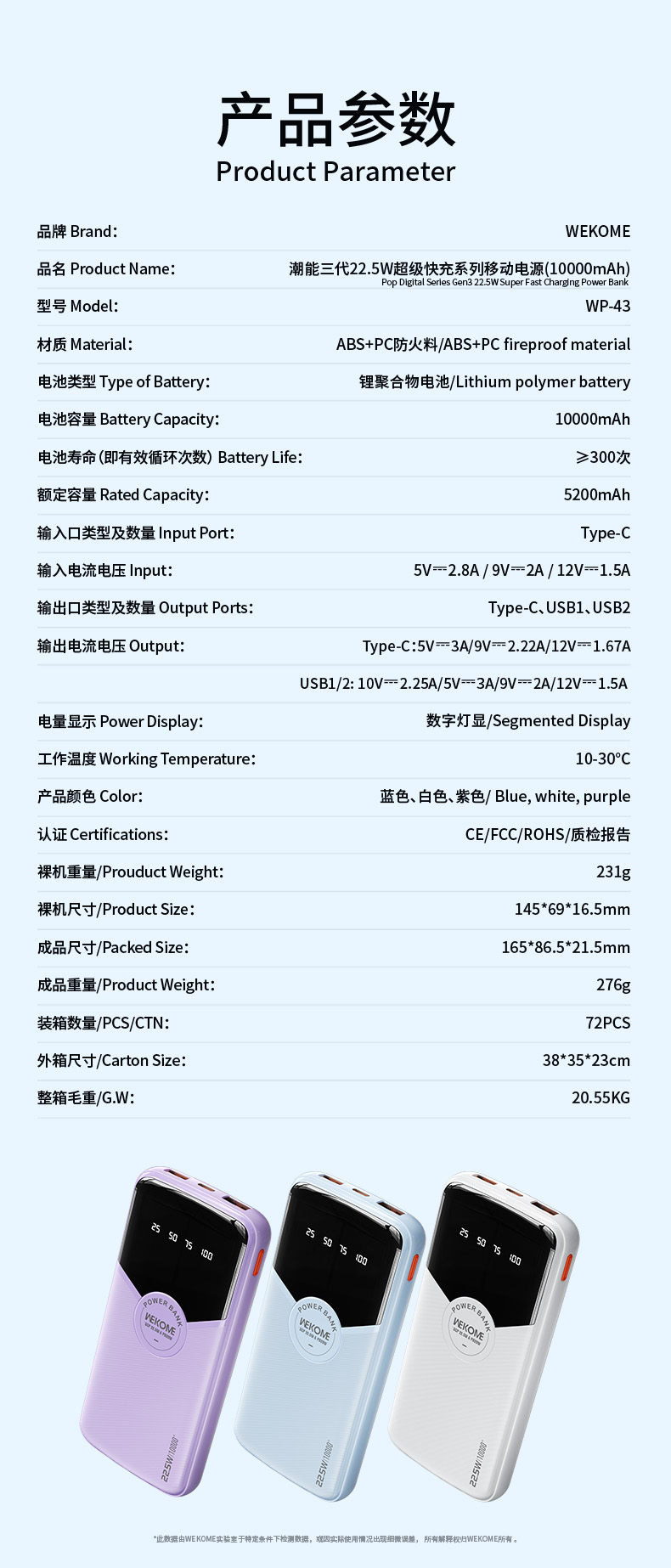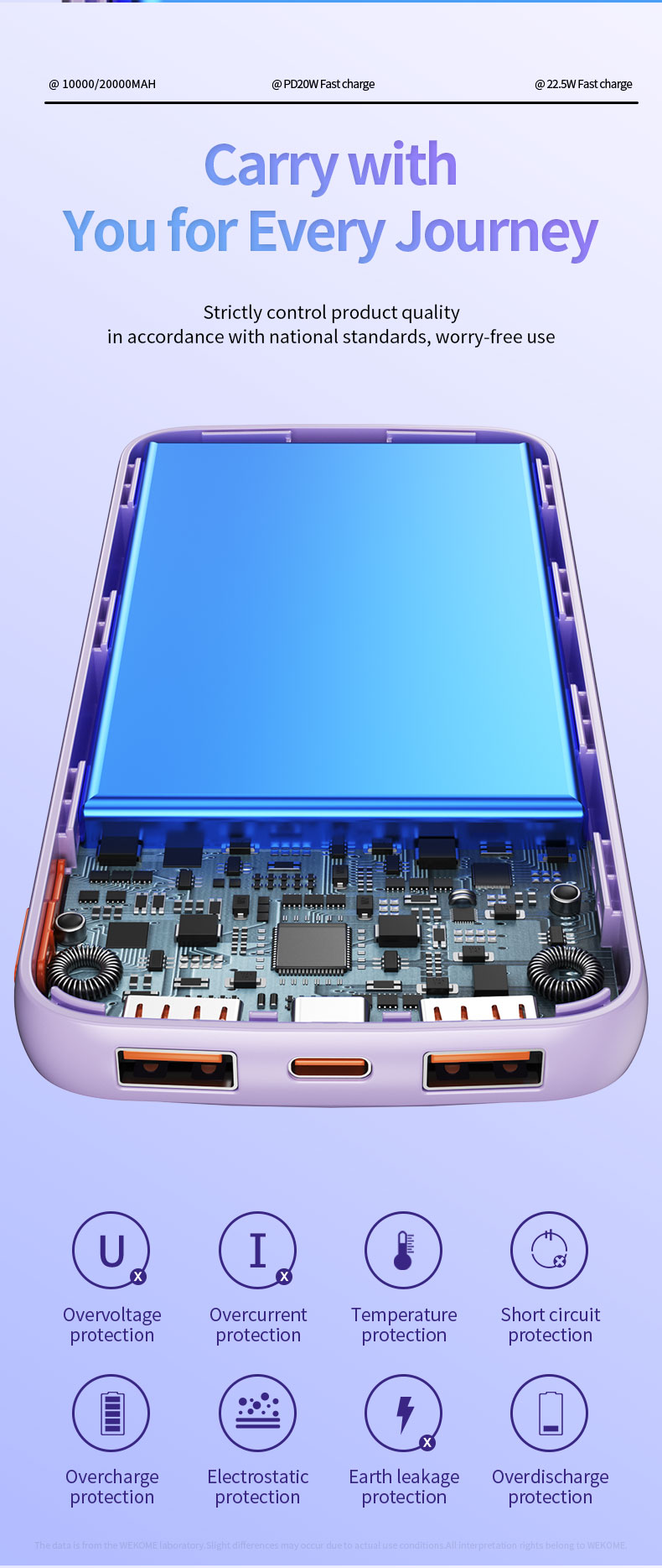 Pin sạc dự phòng WEKOME WP-43 đã được cấp chứng nhận CE, FCC, ROHS và đã trải qua các báo cáo kiểm định chất lượng, đảm bảo sản phẩm đạt tiêu chuẩn an toàn và chất lượng cao nhất. Với các chứng nhận này, bạn có thể hoàn toàn yên tâm về độ tin cậy và hiệu quả của sản phẩm trong suốt quá trình sử dụng.