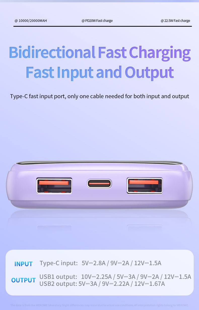 Pin sạc dự phòng WEKOME WP-43 được trang bị ba cổng đầu ra bao gồm Type-C, USB1 và USB2, mang đến khả năng sạc nhiều thiết bị cùng lúc. Cổng đầu vào Type-C hỗ trợ nhiều mức điện áp như 5V-2.8A, 9V-2A, và 12V-1.5A, giúp sạc lại pin nhanh chóng và hiệu quả.