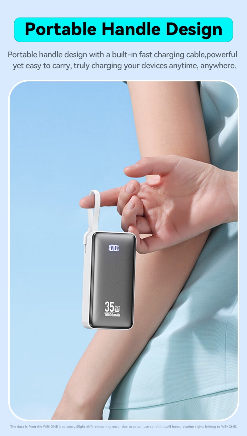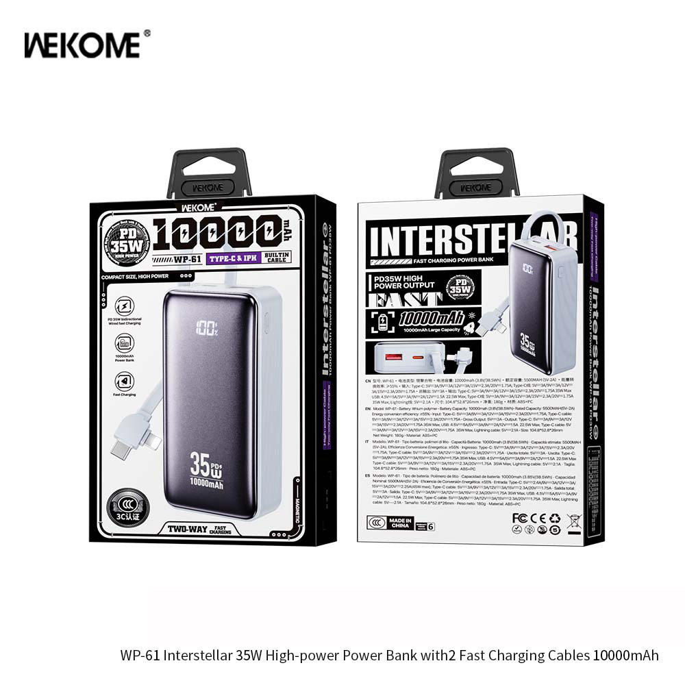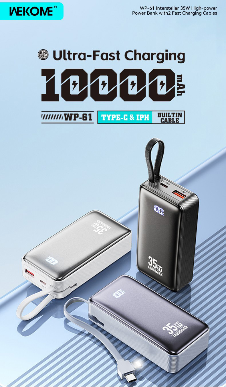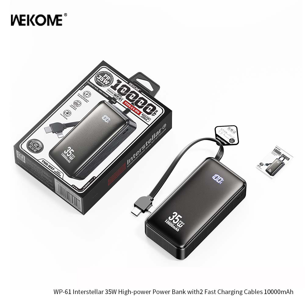 Pin sạc dự phòng Wekome WP-61 10000mAh, Cáp TypeC và Cổng TypeC In/Out PD 35W, cáp LN 2.1A, USB-A QC 22.5W