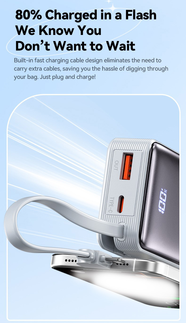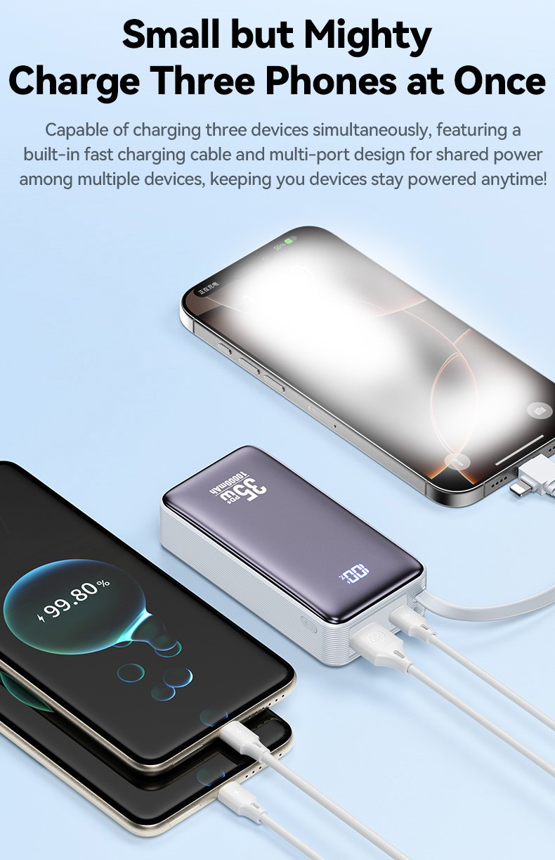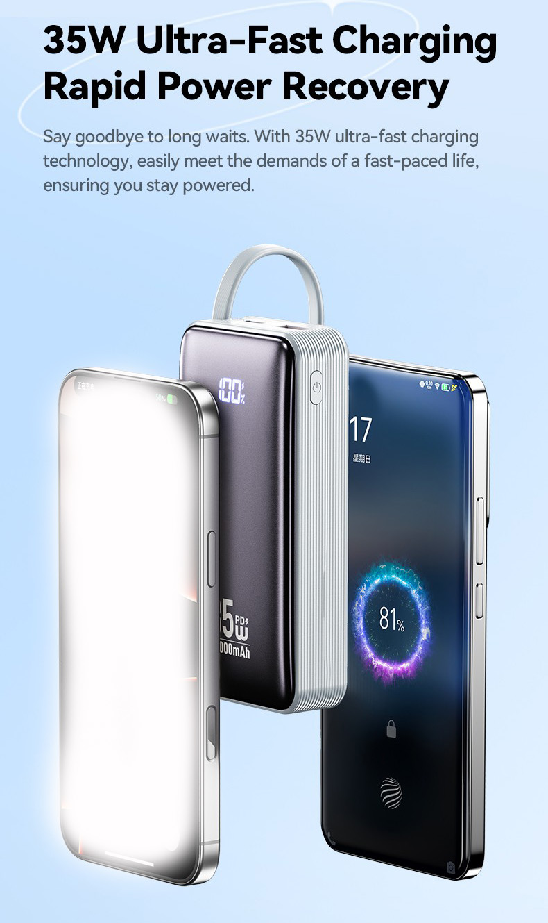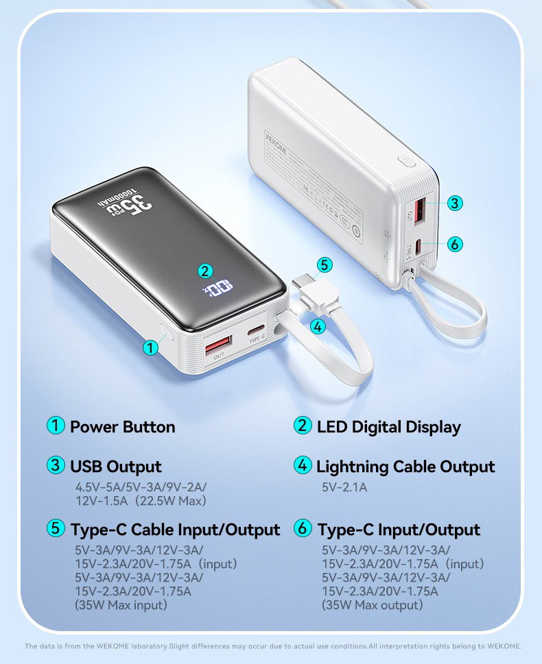 Pin sạc dự phòng Wekome WP-61 10000mAh, Cáp TypeC và Cổng TypeC In/Out PD 35W, cáp LN 2.1A, USB-A QC 22.5W